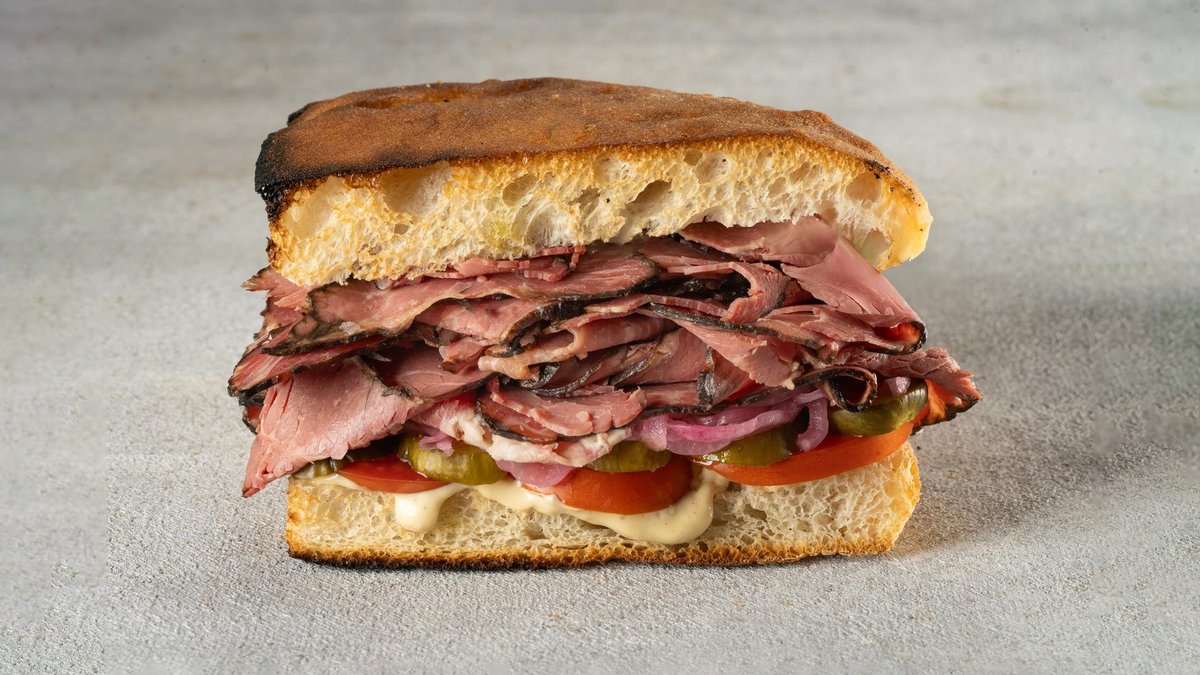 פניני איטלקי עם קורנדביף, איולי חרדל, עגבנייה, מלפפון חמוץ ובצל סגול כבוש