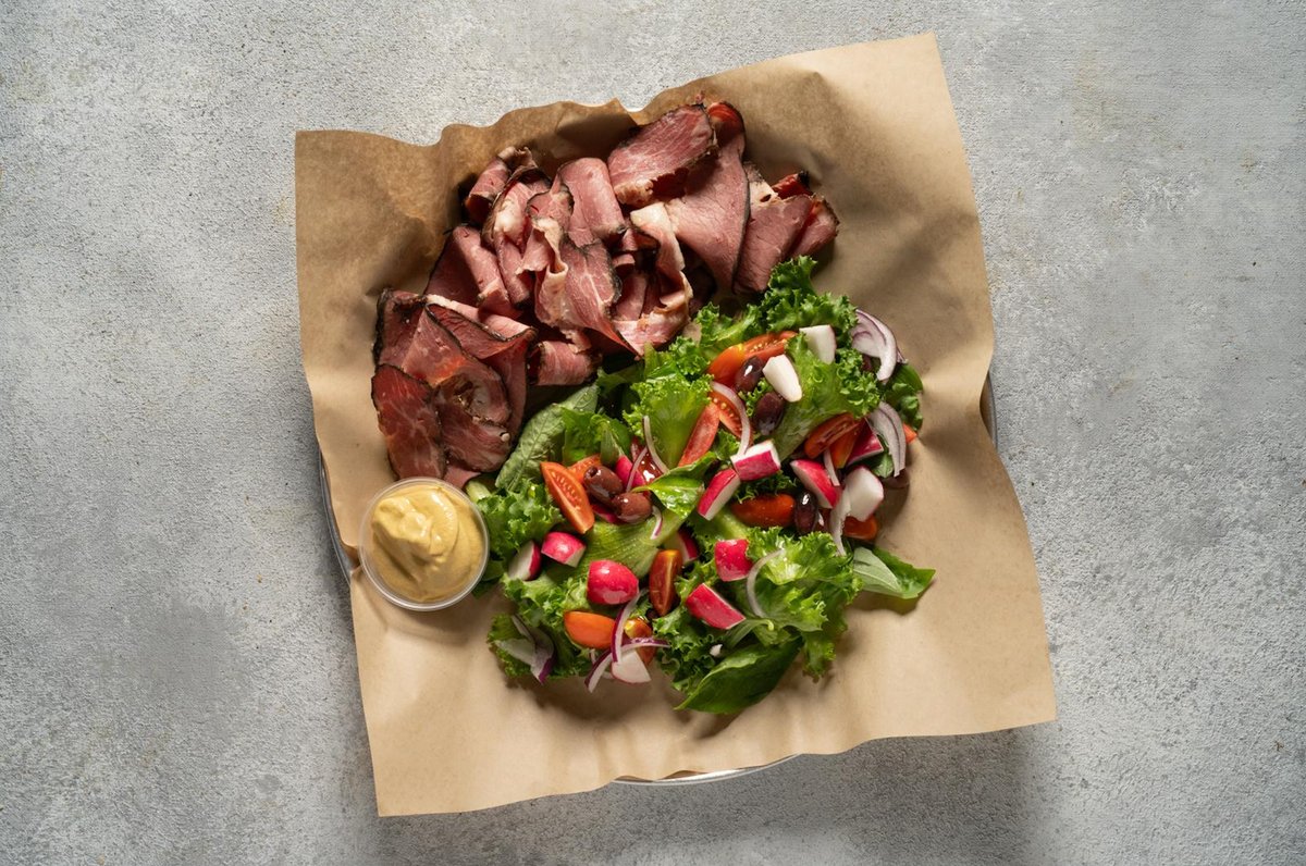 סלט חסה לליק, עגבניות שרי, צנונית, זיתי קלמטה, עלי בזיליקום שמן זית לימון, איולי חרדל ונקניק לבחירה.
