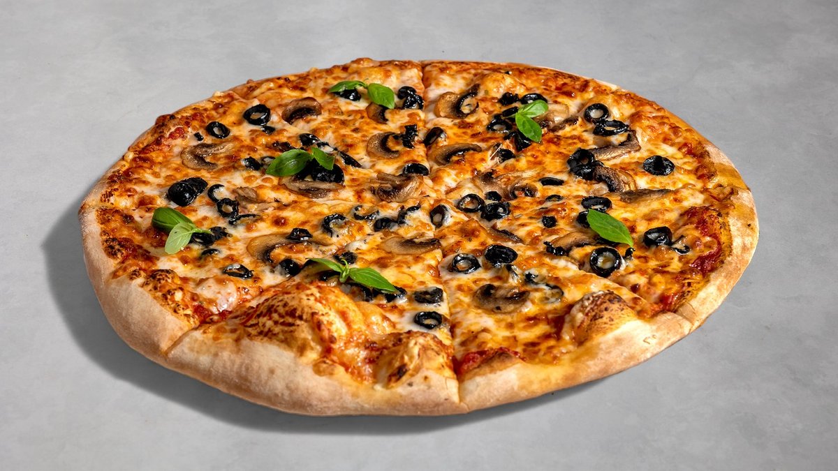 רוטב עגבניות, גבינה, פטריות, זיתים שחורים ואורגנו