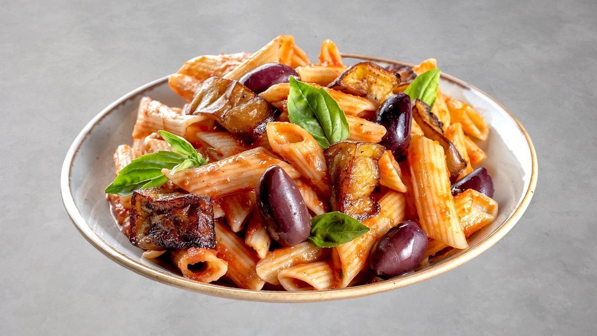 פסטה פנה עם חצילים,ז יתי קלמטה וצ'ילי חריף בחמאת שום ורוטב עגבניות