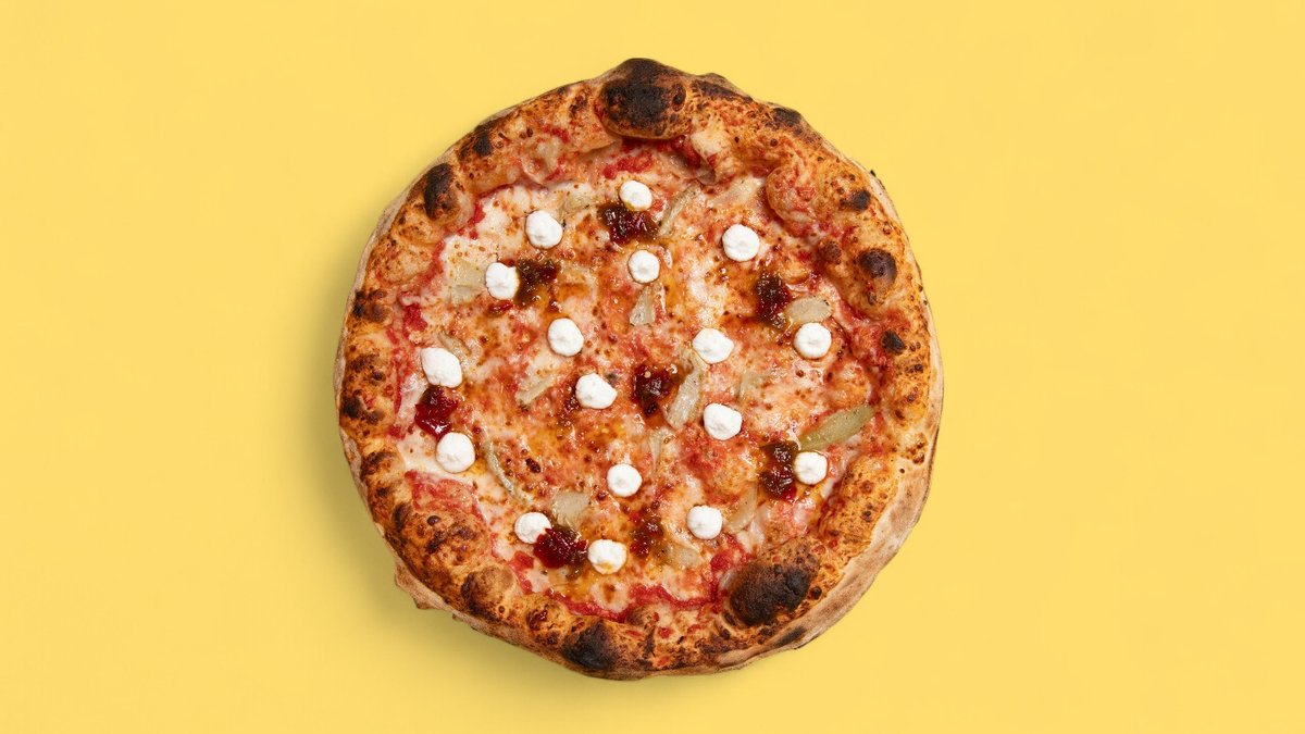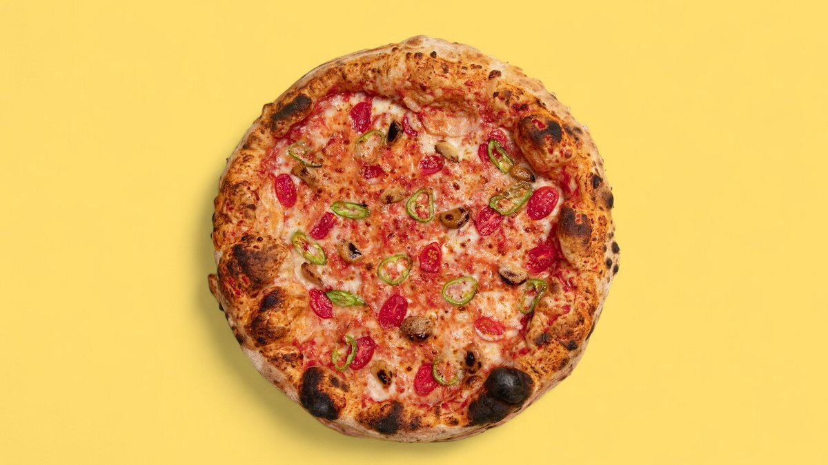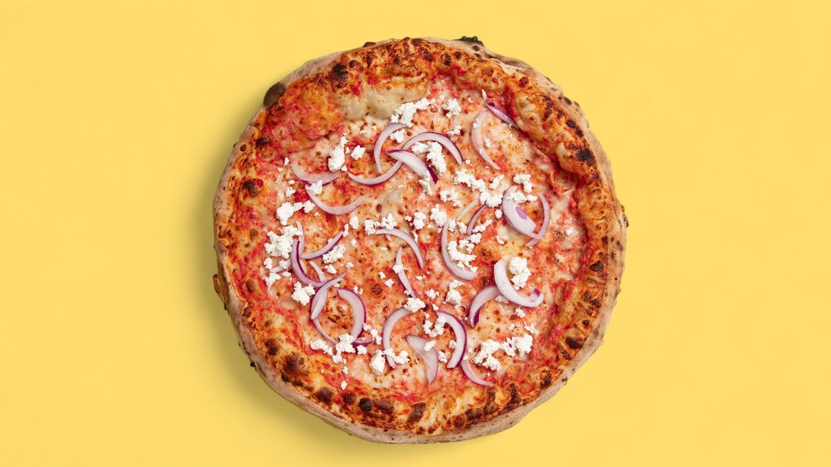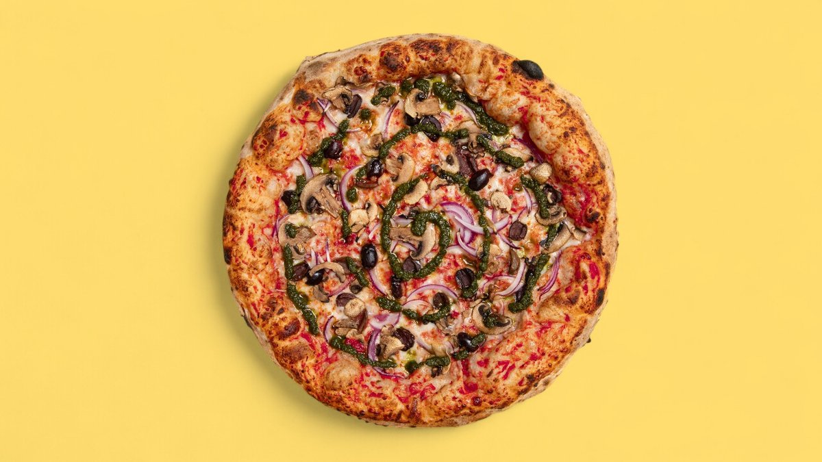 רוטב עגבניות, בצל סגול, פטריות, זיתי קלמטה ופסטו