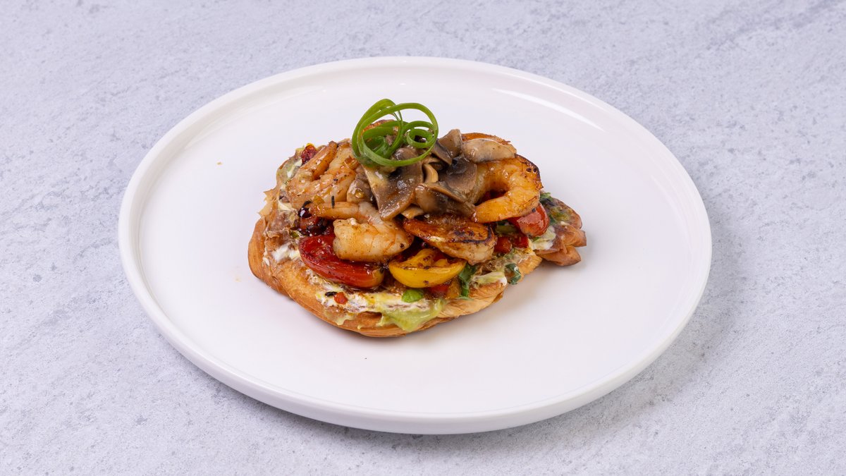 קרואסון חמאה קלוי, פטריות מוקפצות עם עגבניות שרי, גבינת שמנת, רוטב פסטו, אבוקדו ובצל ירוק