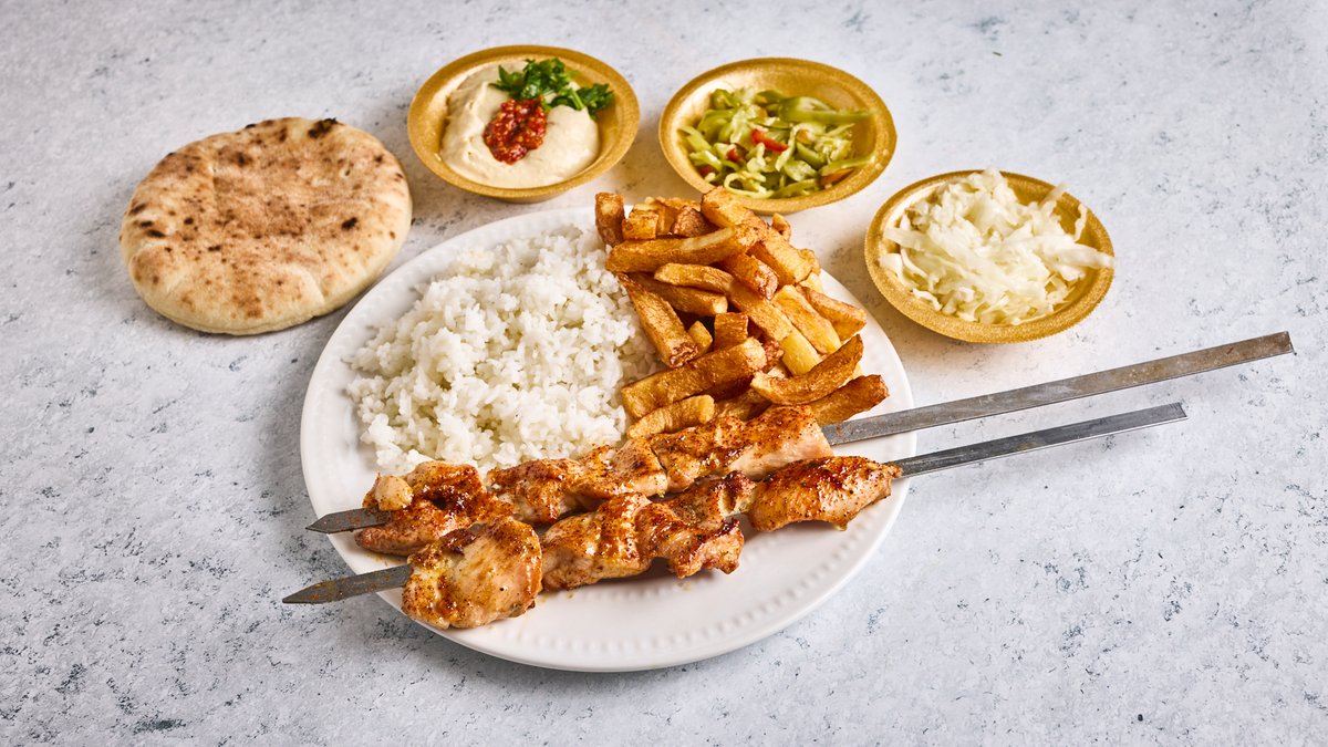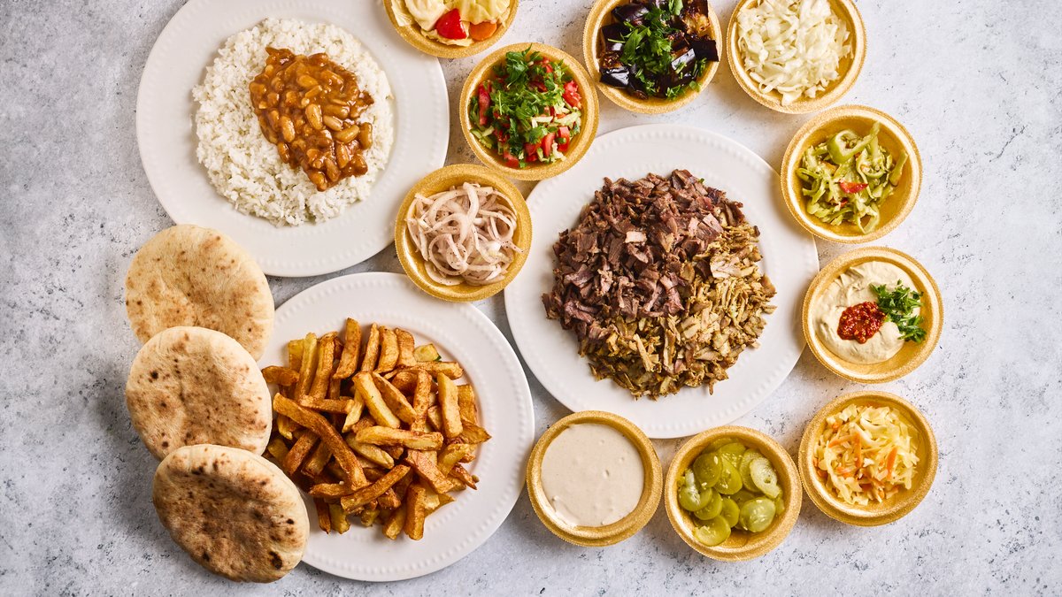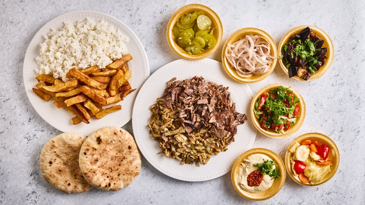 בחרו סוג שווארמה | מוגש עם 4 תוספות, 10 סלטים ו3 פיתות