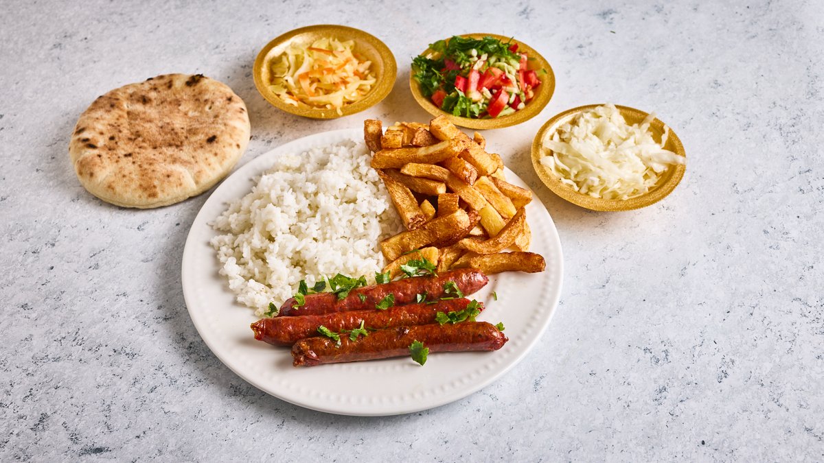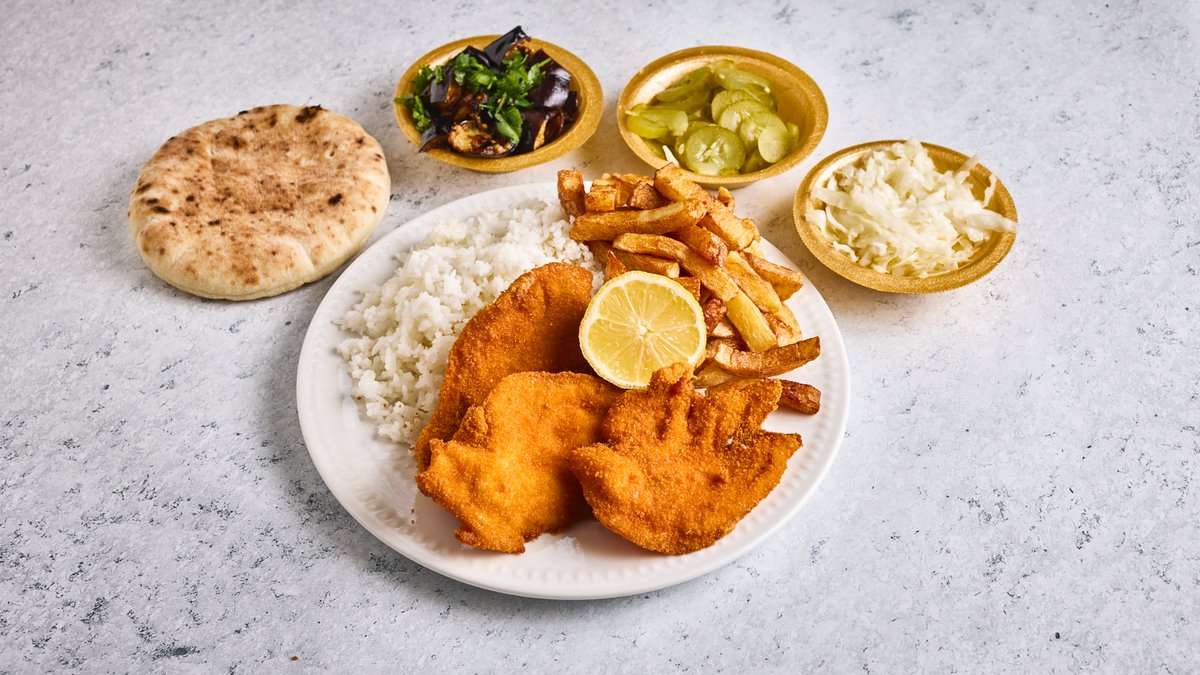 מוגש עם 2 תוספות, 3 סלטים ופיתה