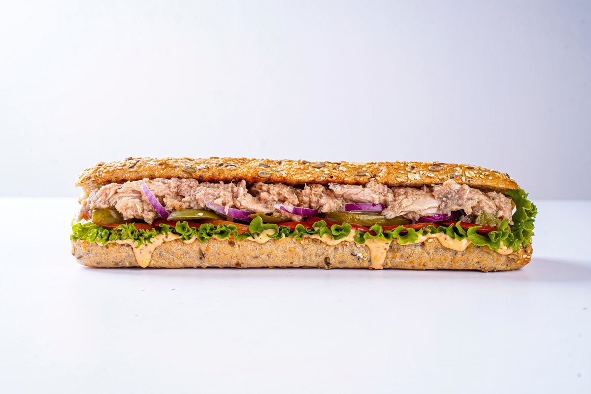 טונה, חסה, עגבניות שרי, מלפפון, בצל אדום, זיתי קלמטה ורוטב ראנץ׳ התמונה להמחשה בלבד