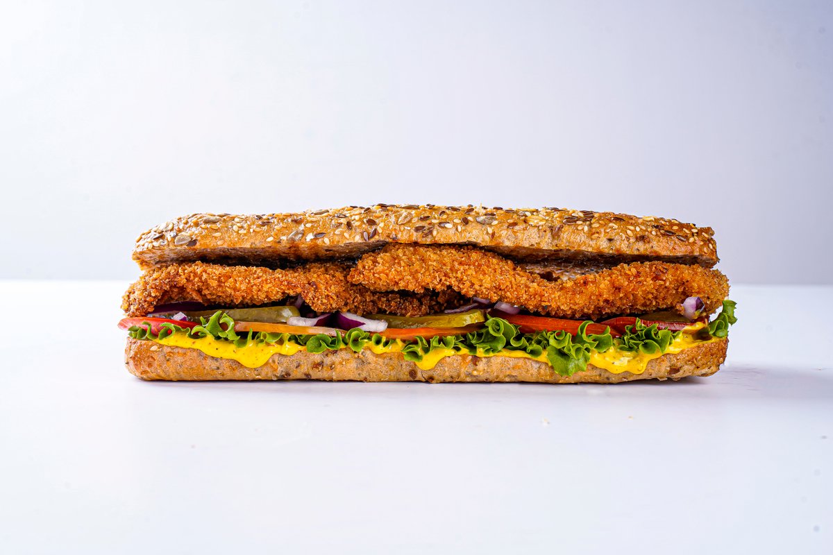 קריספי שניצל, חסה, מלפפון, מלפפון חמוץ, כרוב אדום, תירס ורוטב קריספי התמונה להמחשה בלבד
