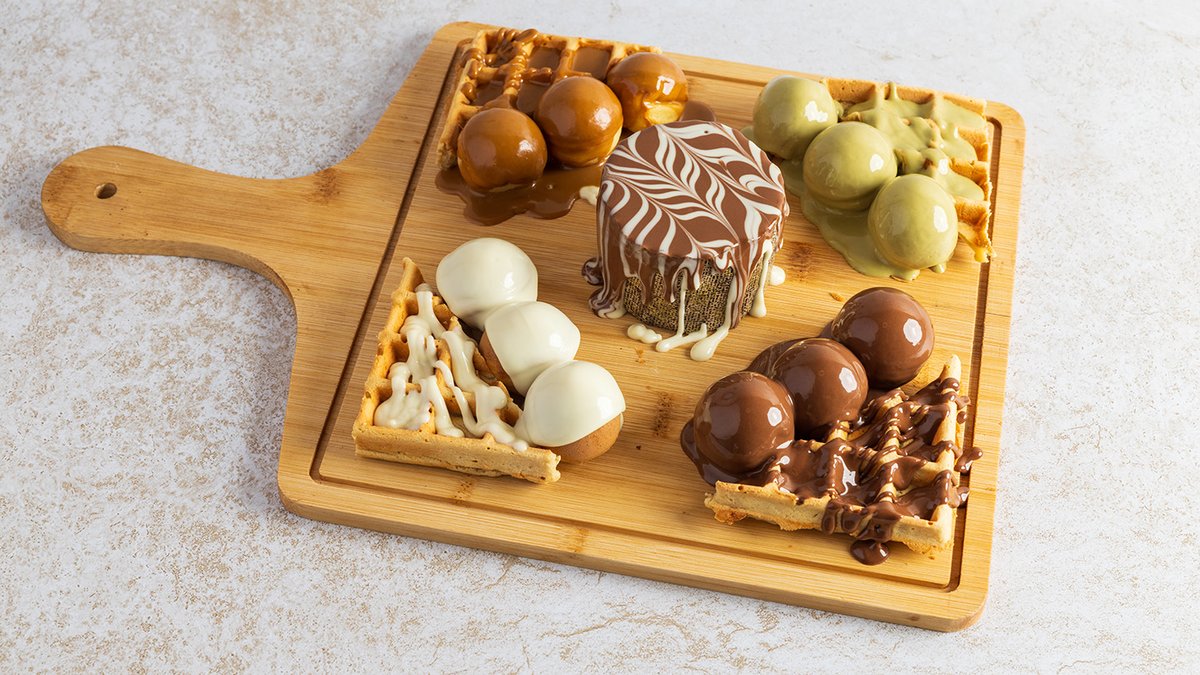 وافل نوتيلا، شوكولاتة بيضاء، 2 كرات بوظة واصبع كندر للاختيار