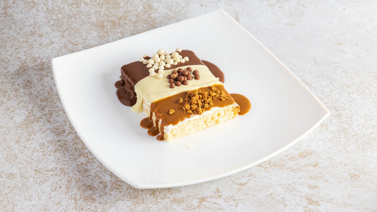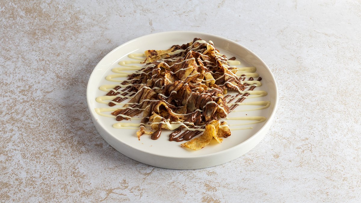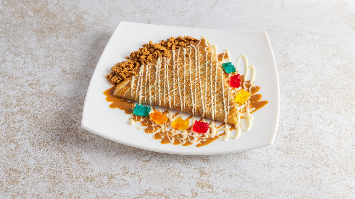 كريب مع نوتيلا مغطى سيروب لوتس وشوكولاتة بيضاء