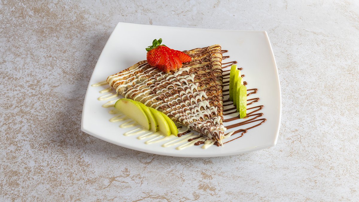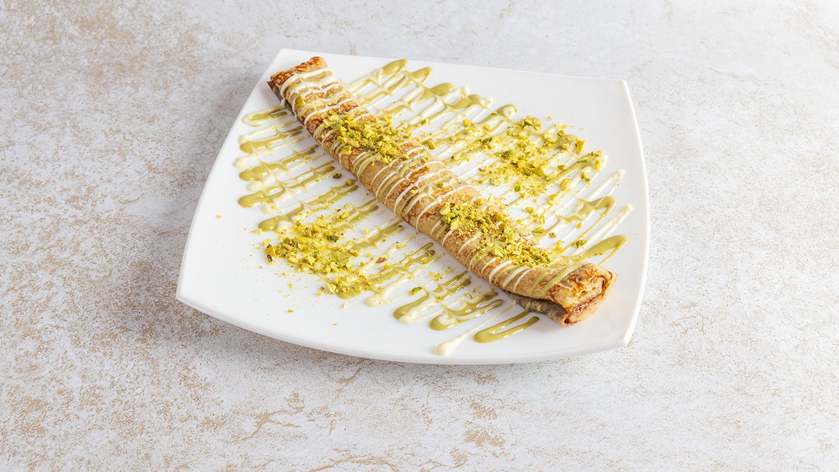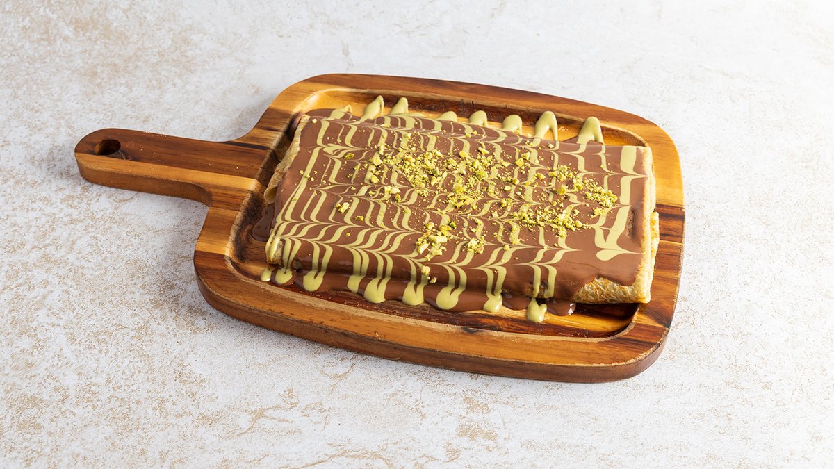 كريب مع نوتيلا مغطى سيروب فستق وشوكولاتة بيضاء