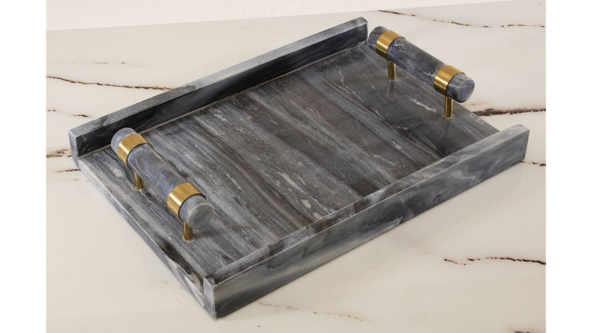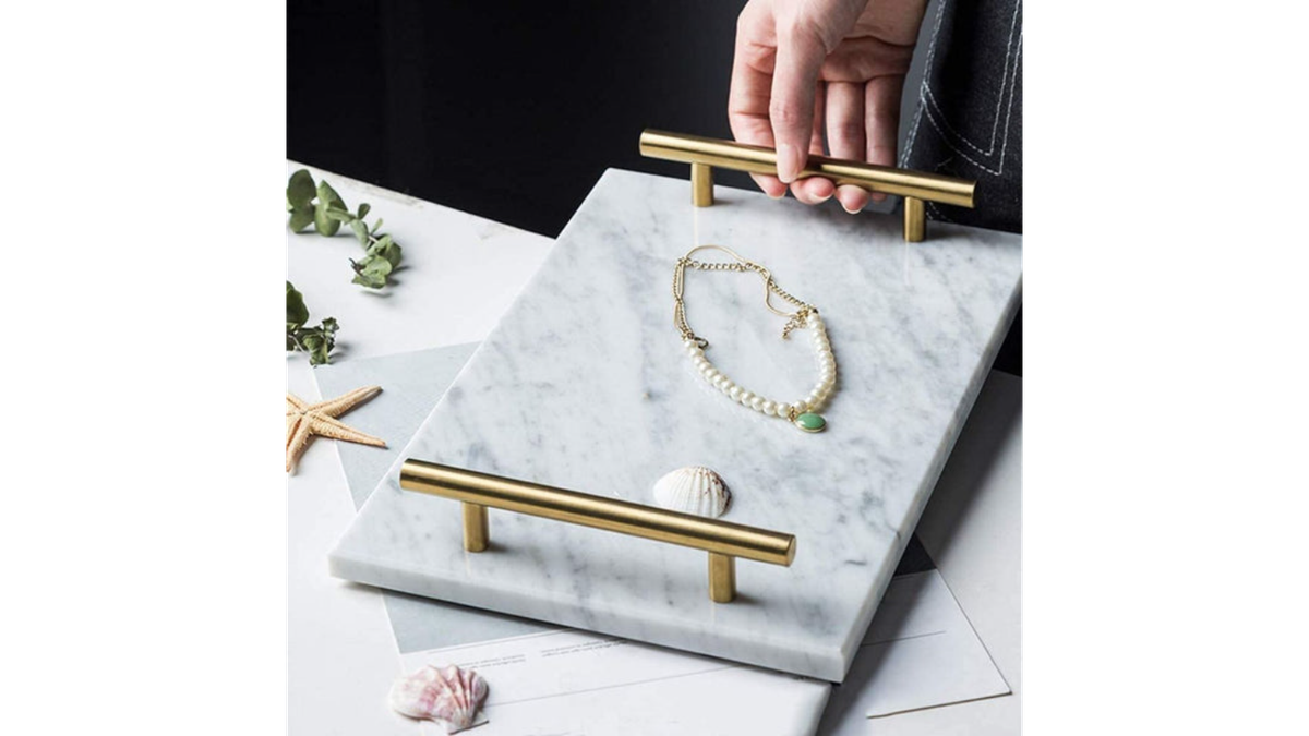 מגש שיש לבן עם ידיות זהב – פריט עיצוב והגשה יוקרתי