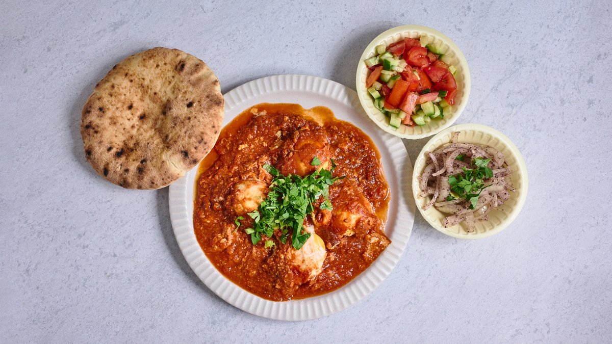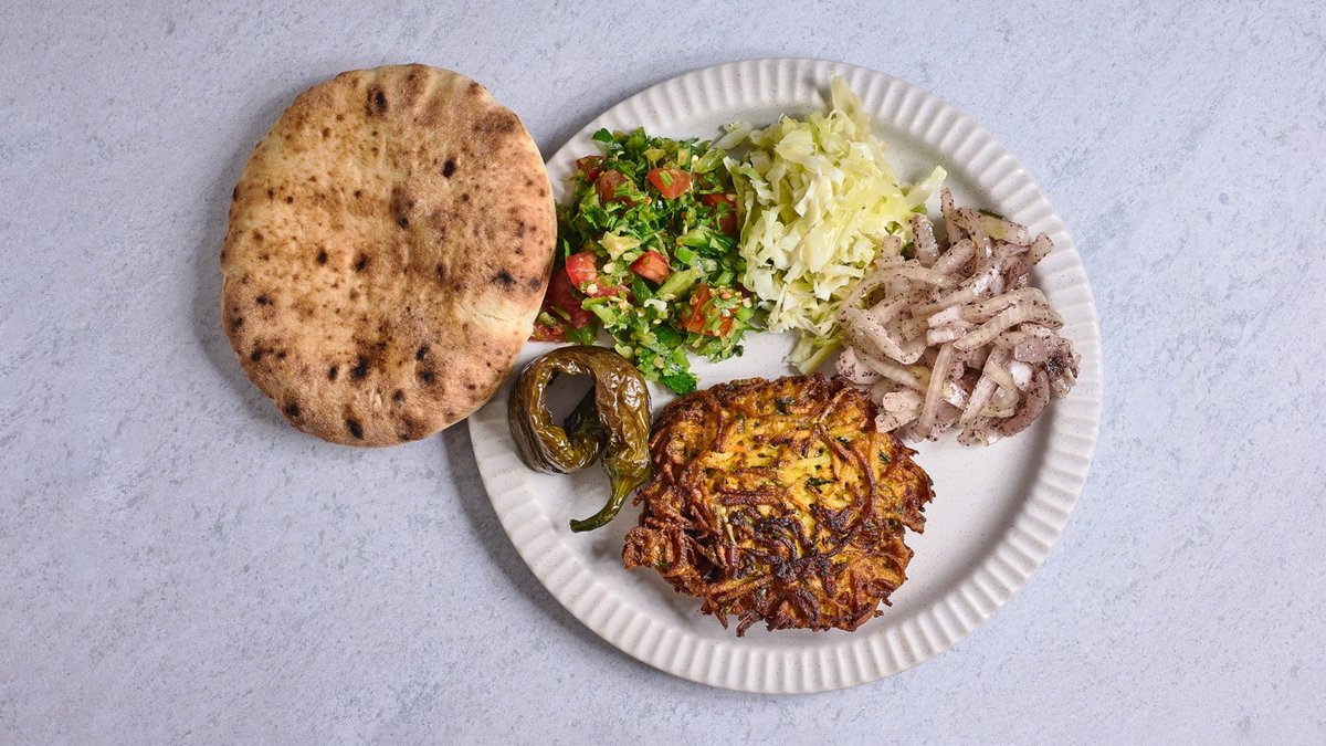 מוגש עם סלט ירקות, כרוב לבן, חמוצים, חומוס, טחינה ופיתה