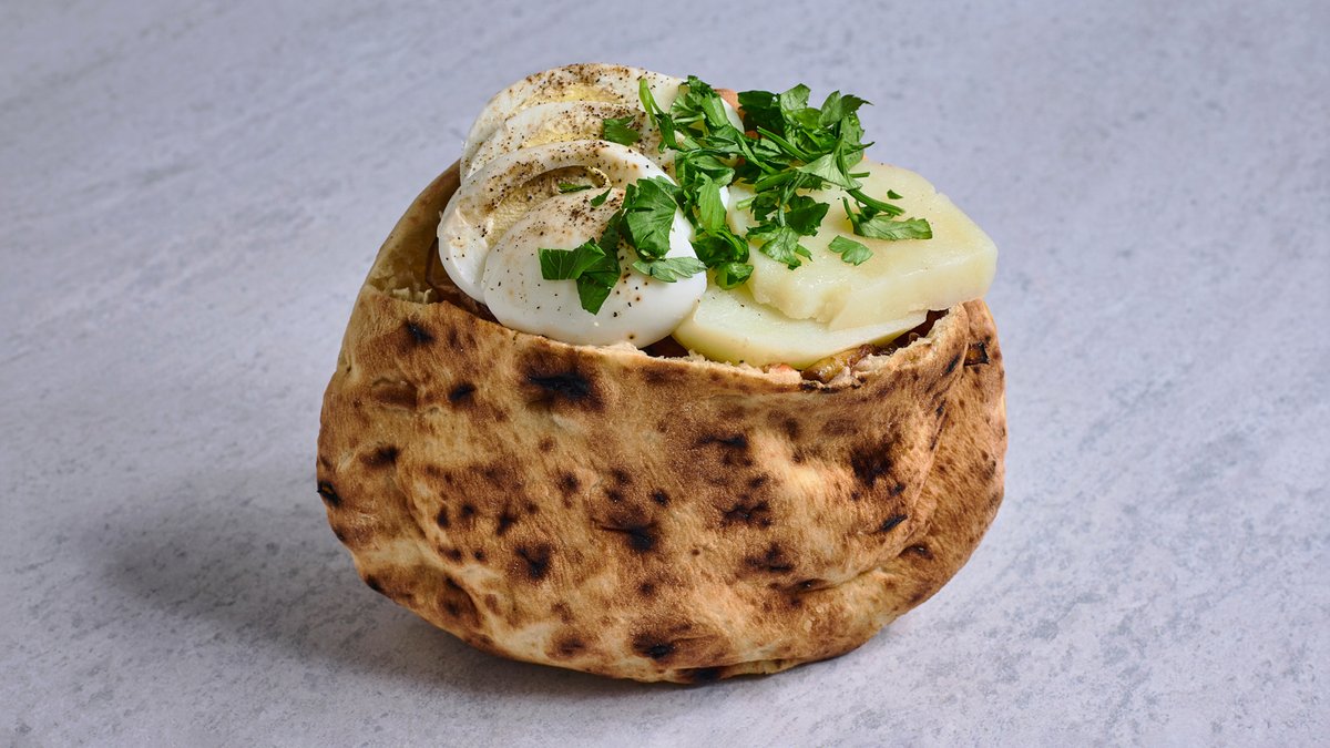 ביצה קשה, חצילים ותפו״א עם סלטים וממרחים לבחירה