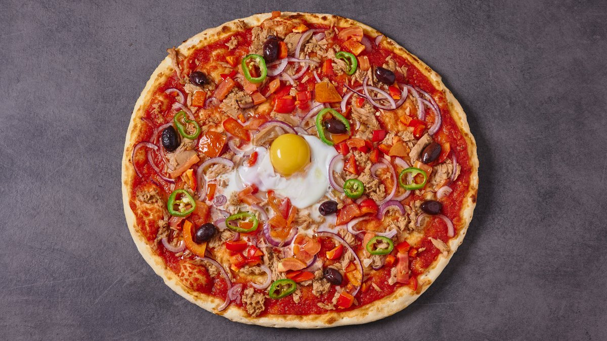פיצה ללא גבינה, טונה, חלפיניו, בצל, עגבניה, גמבה אדומה, זיתי קלמטה, ביצה וצלפים. ניתן לבקש עם גבינה. | בחרו גודל