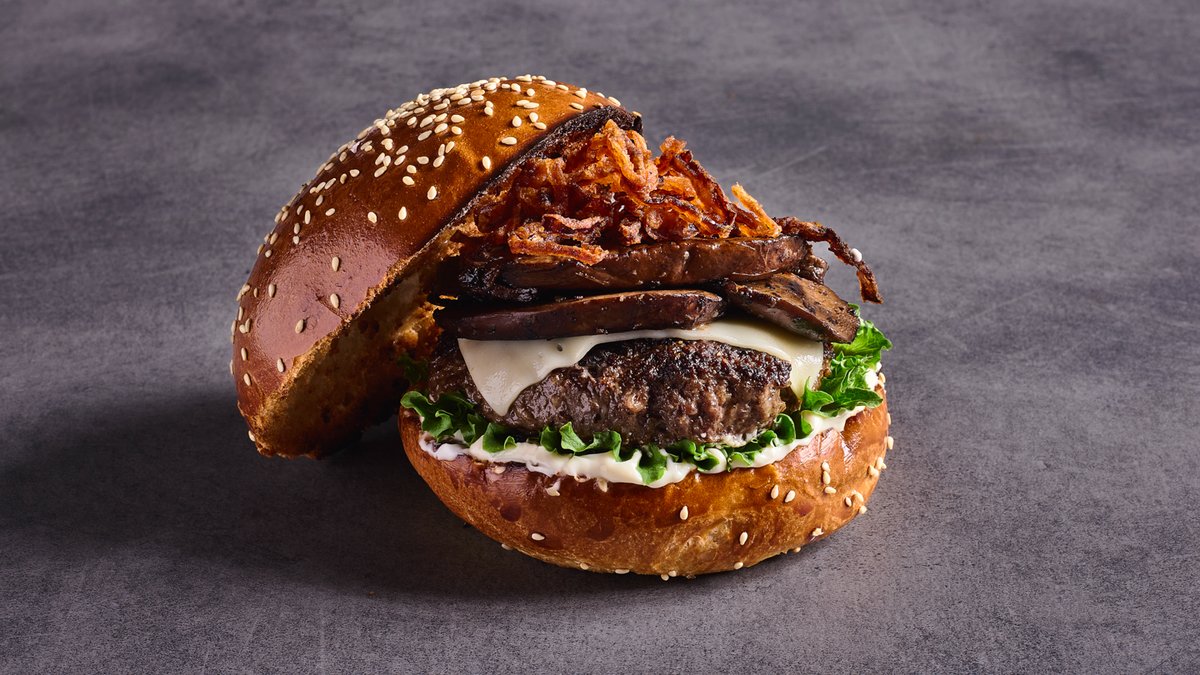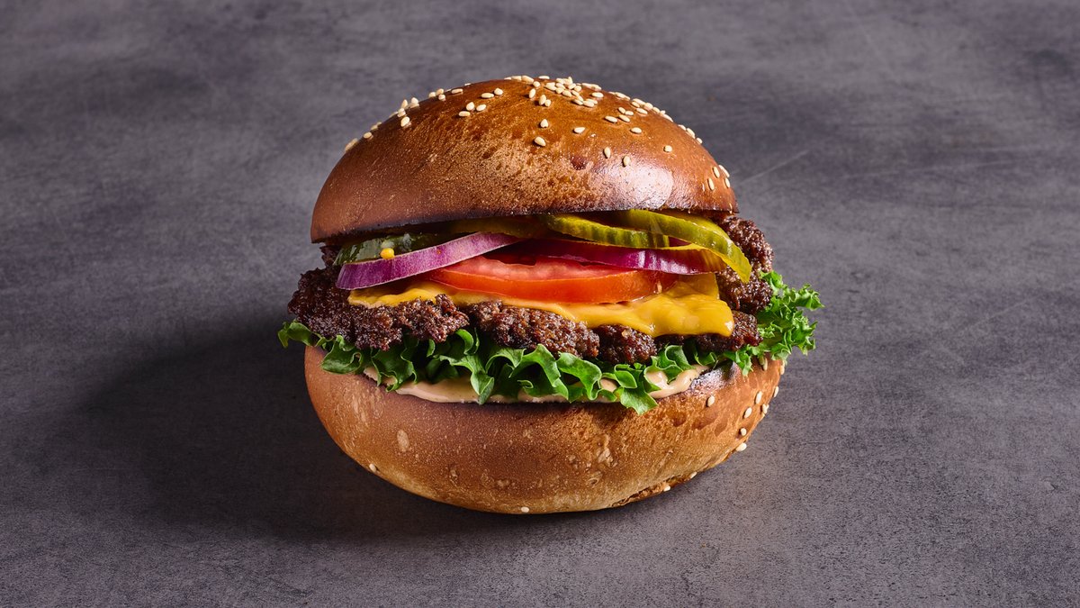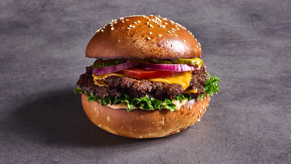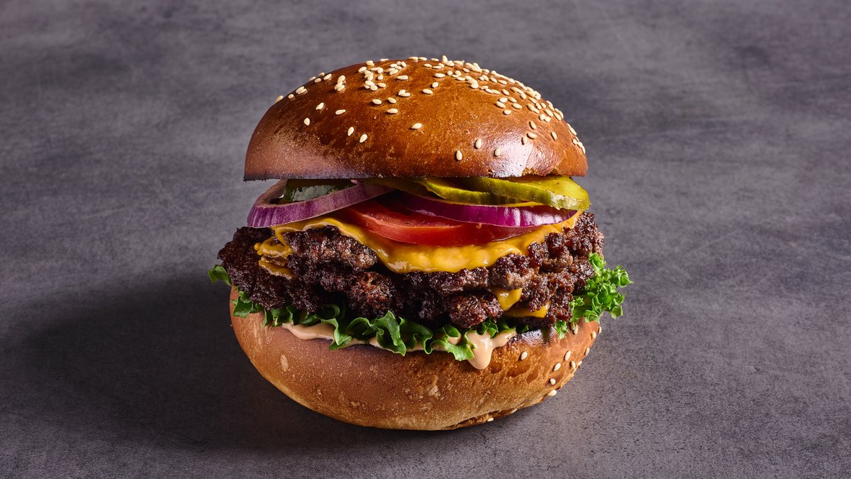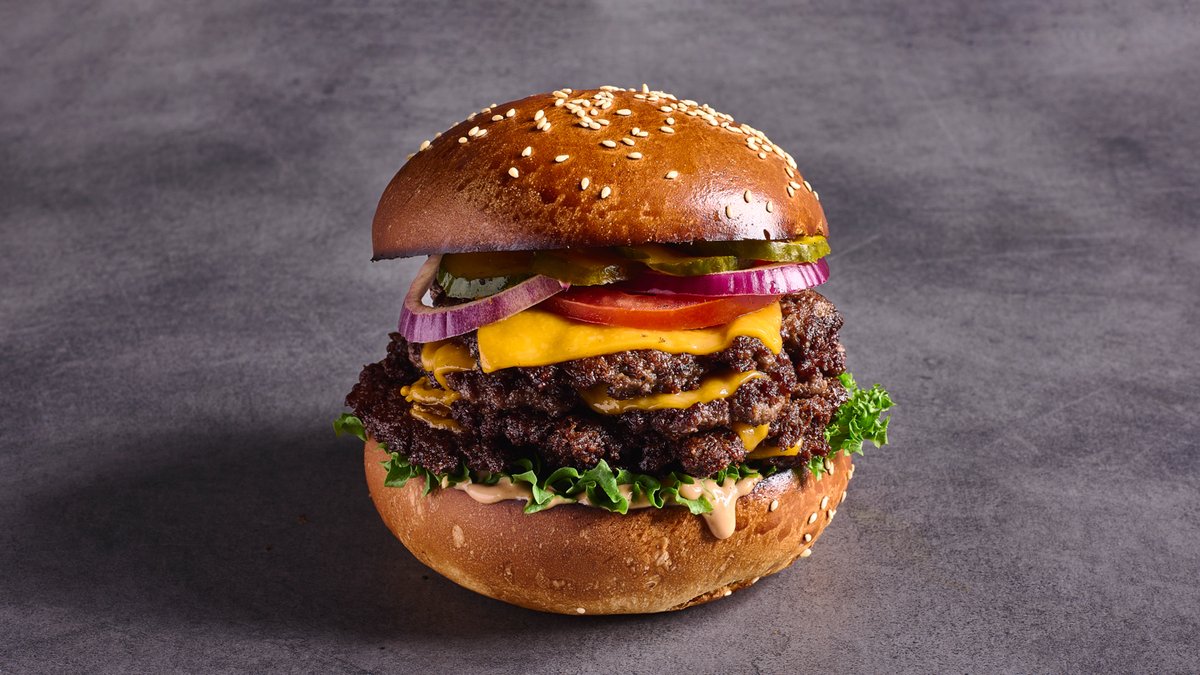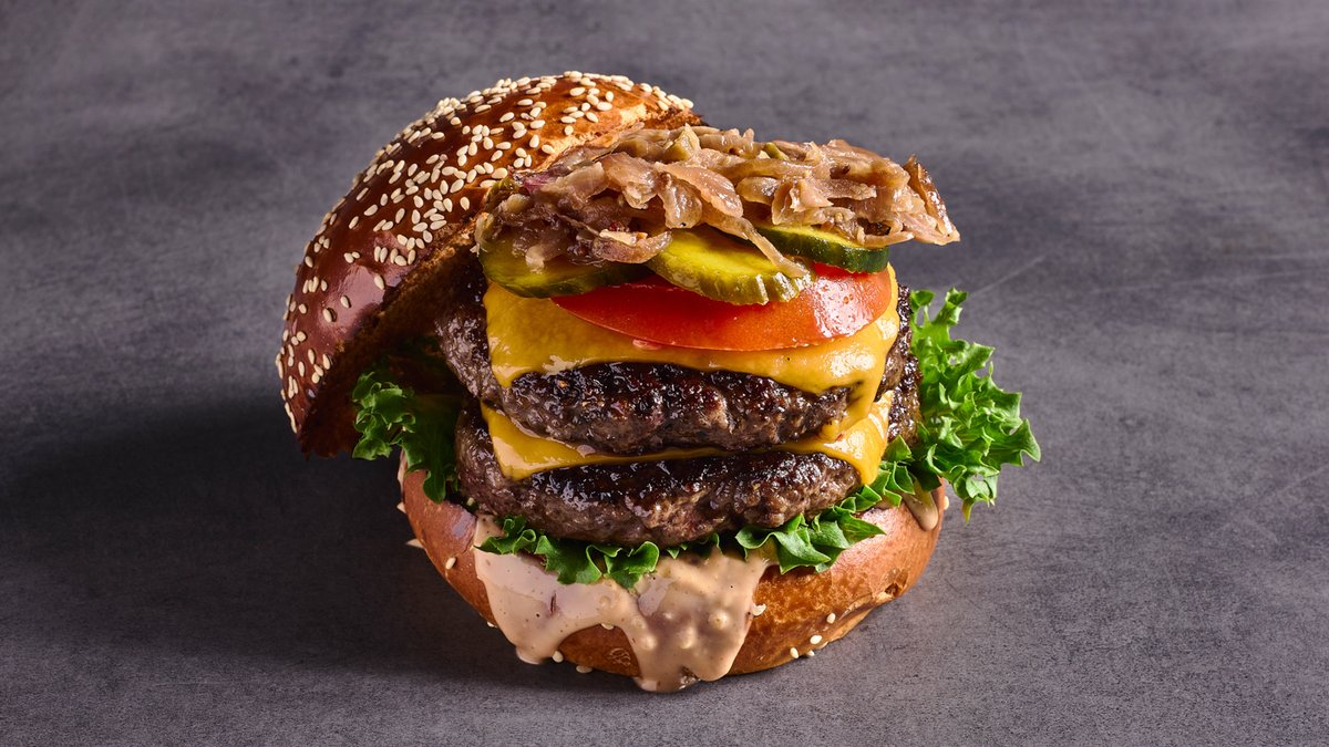 סטייק בורגר כפול צרוב בחרדל, פי שתיים צ'דר טבעונית, בצל וחלפיניו מקורמלים בחרדל, עגבנייה, מלפפון חמוץ ורוטב אנימל