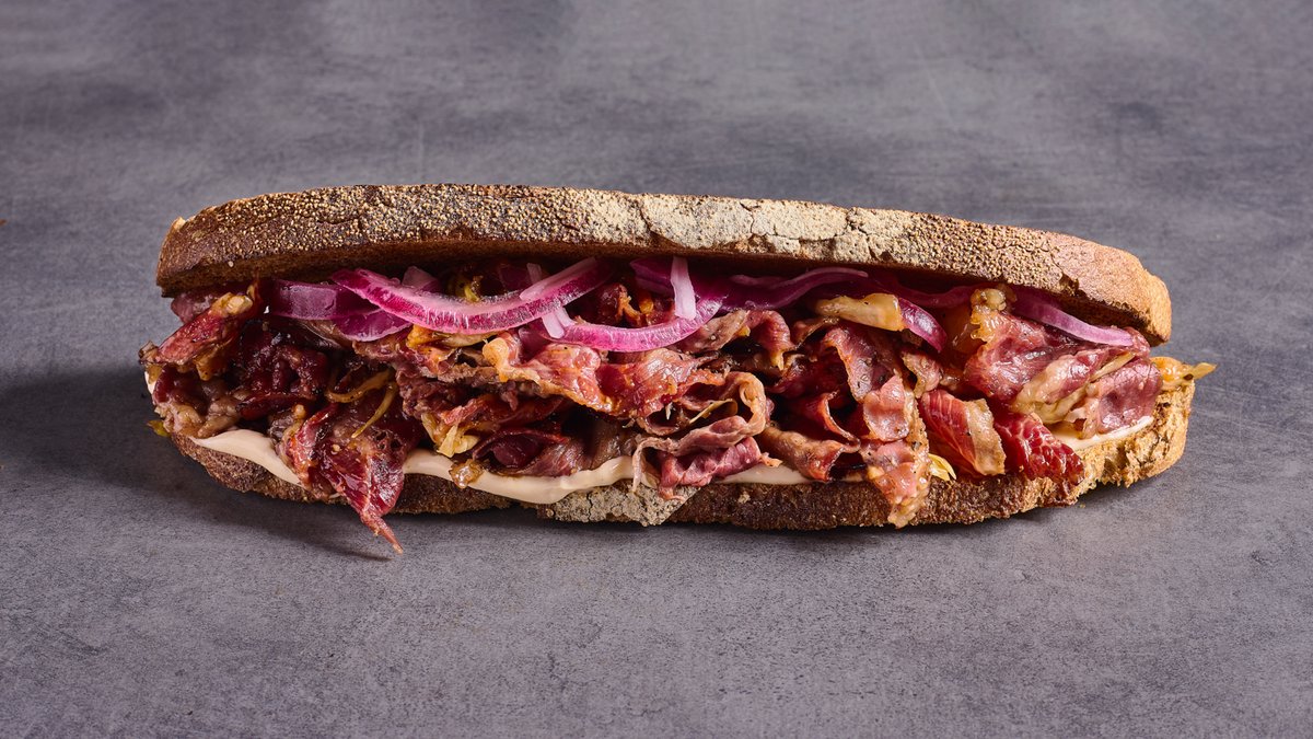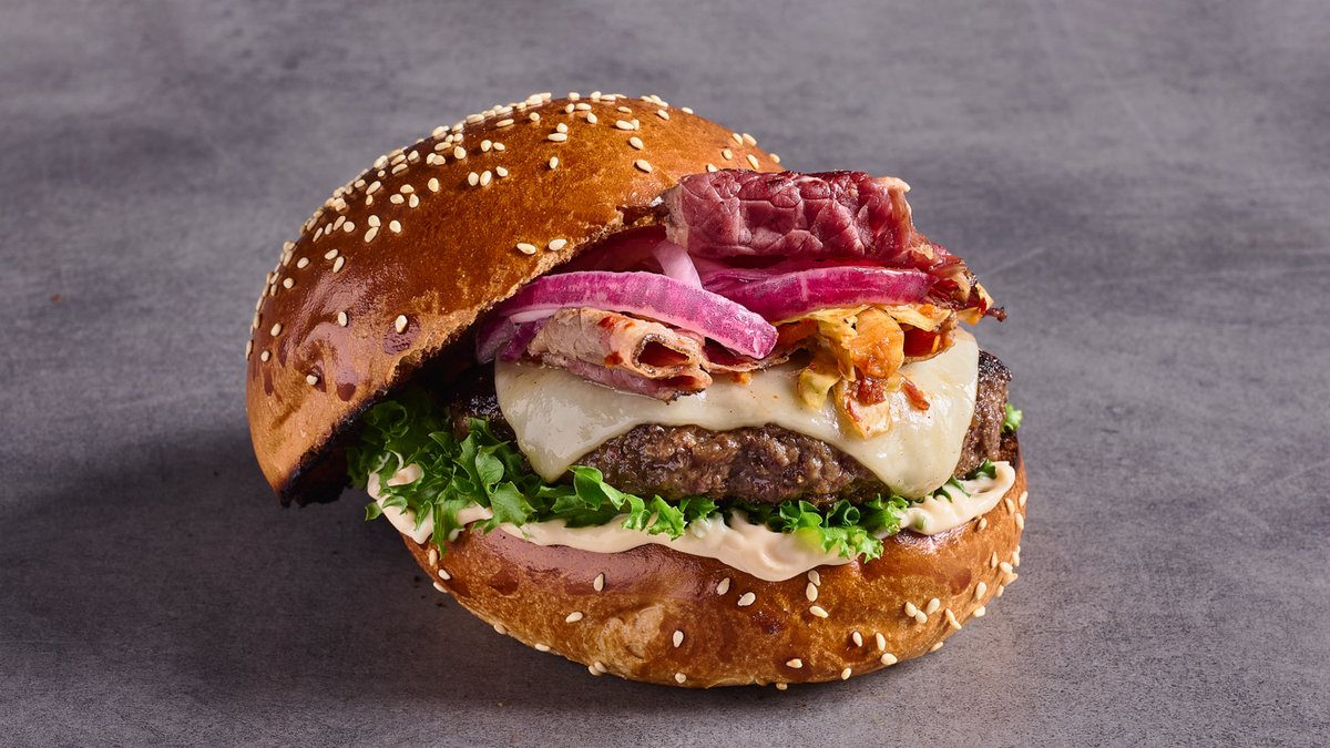 פסטרמת בקר ניו-יורק סטייל, מוצרלה טבעונית, קימצ'י, בצל כבוש ומיונז סרירצ'ה-כמהין בלחם מחמצת קלוי