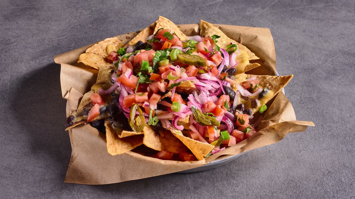 נאצ'וס מטורטיות תירס, פיקו דה גאיו, שעועית שחורה, בצל כבוש, כוסברה, גבינה טבעונית וחלפיניו כבוש