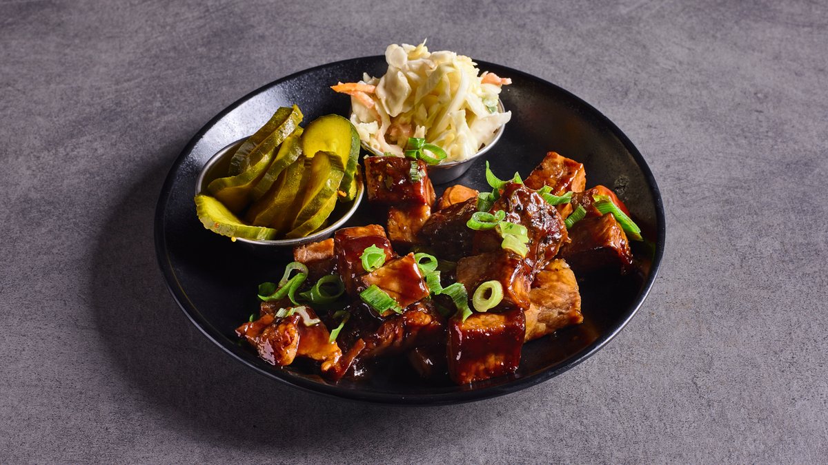 נגיסי חזה בקר מעושנים, רוטב ברביקיו, חמוצים, קולסלאו ושומשום
