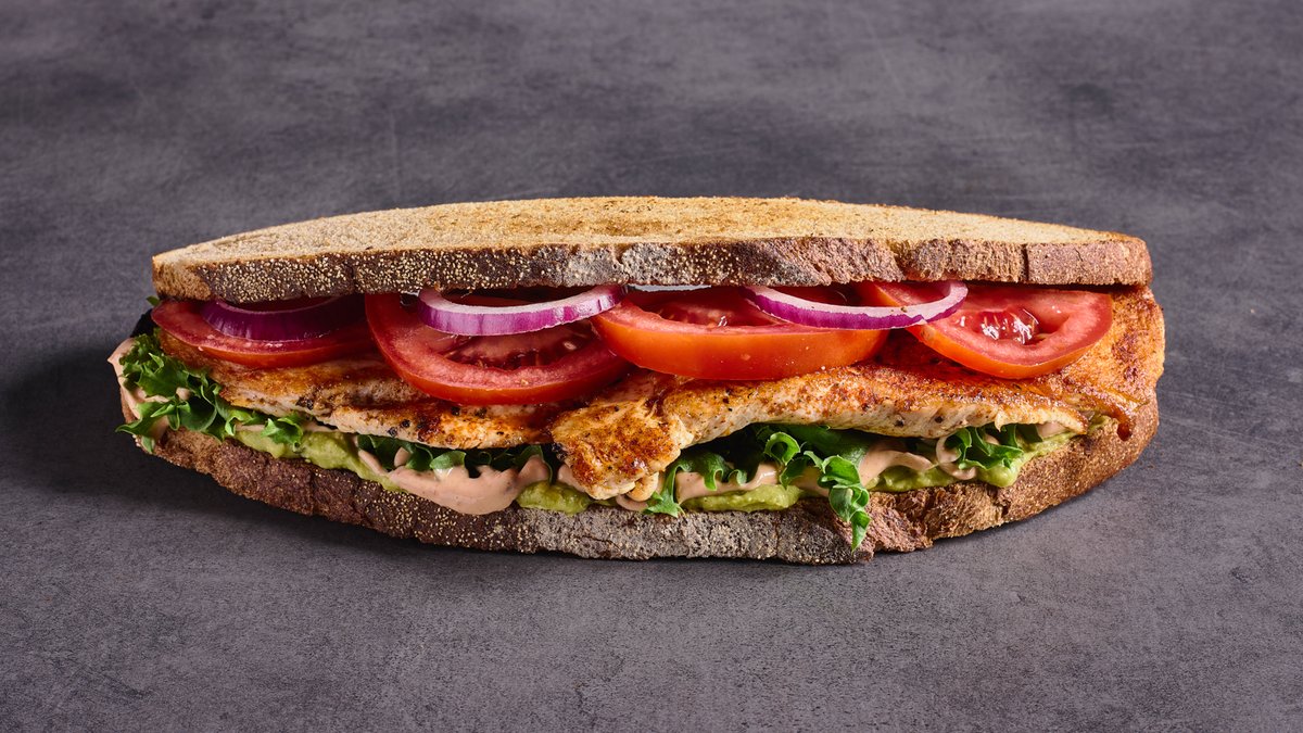 חזה עוף בגריל מתובל בקייג'ון, פייקון טלה, גוואקמולי, חסה, עגבנייה, בצל, מיונז צ'יפוטלה, לחם מחמצת קלוי