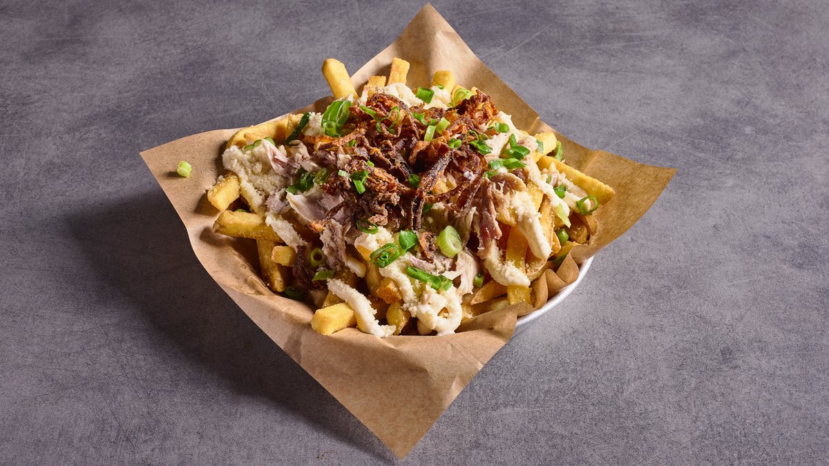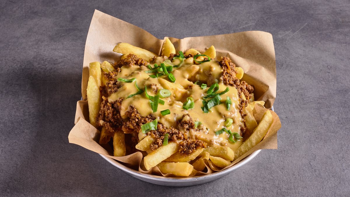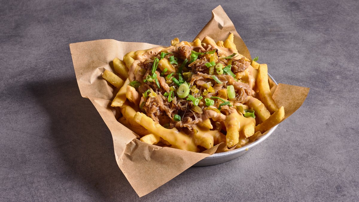הצ׳יפס של קרייב, גבינה טבעונית, רוטב אנימל, בצל וחלפיניו מטוגנים בחרדל