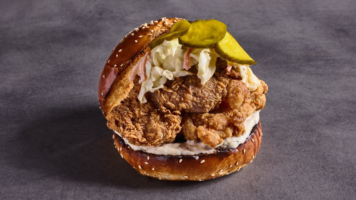 קריספי פרגית, קולסלואו, מלפפון חמוץ, רוטב ראנץ', רוטב ברביקיו Crispy Dark meat chicken (Pargit), coleslaw, pickles, ranch dressing, bbq sauce