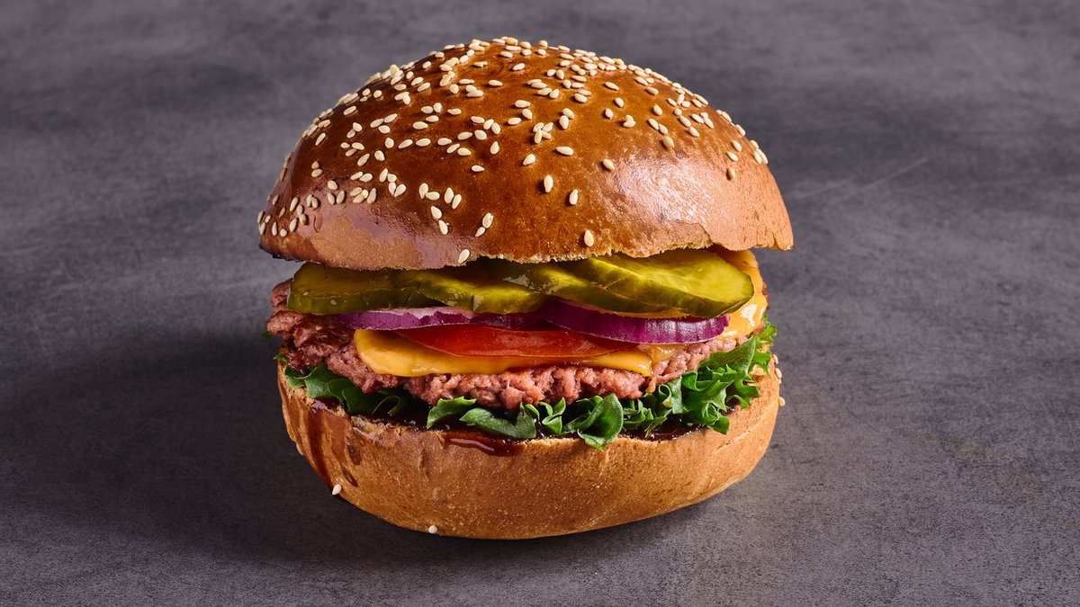 רידיפיין בורגר, צ'דר טבעונית, חסה, עגבנייה, בצל סגול, מלפפון חמוץ ורוטב ברביקיו מבושל בסביבה שאינה סטרילית מבשר ומטוגן על פלאנצ׳ה שמבשלים בה גם בשר