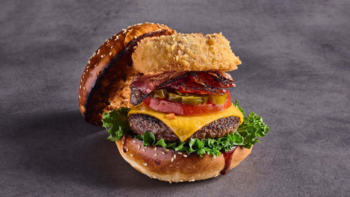 האחד שיש בו הכל 🏆 פיקנטי 🌶️ | צ'דר טבעונית, פייקון טלה בגלייז מייפל סרירצ׳ה, חלפיניו כבוש, טבעת בצל סגול בפנקו, חסה, עגבנייה, בצל, מיונז שום ורוטב ברביקיו