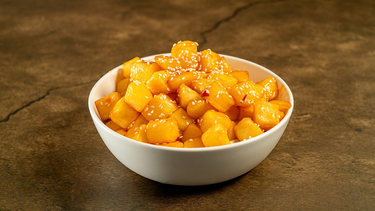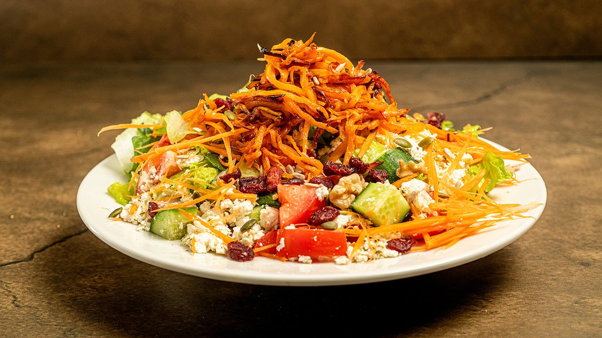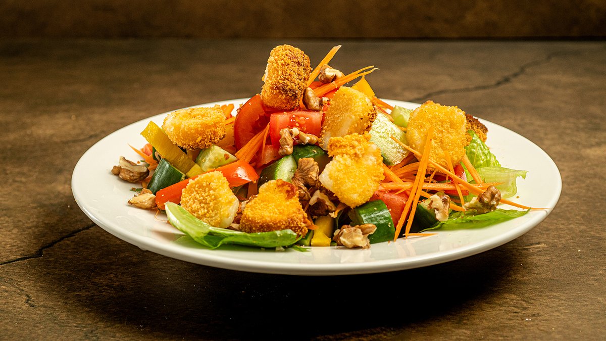 קוביות חלומי פריכות ובטטה על מצע חסות, ירקות שוק ואגוזי מלך