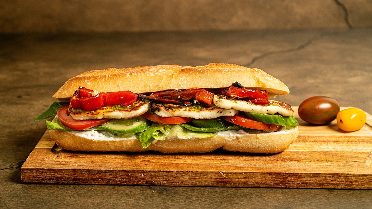 חלומי צרוב, ממרח פסטו, חסה, עגבנייה ופלפל קלוי