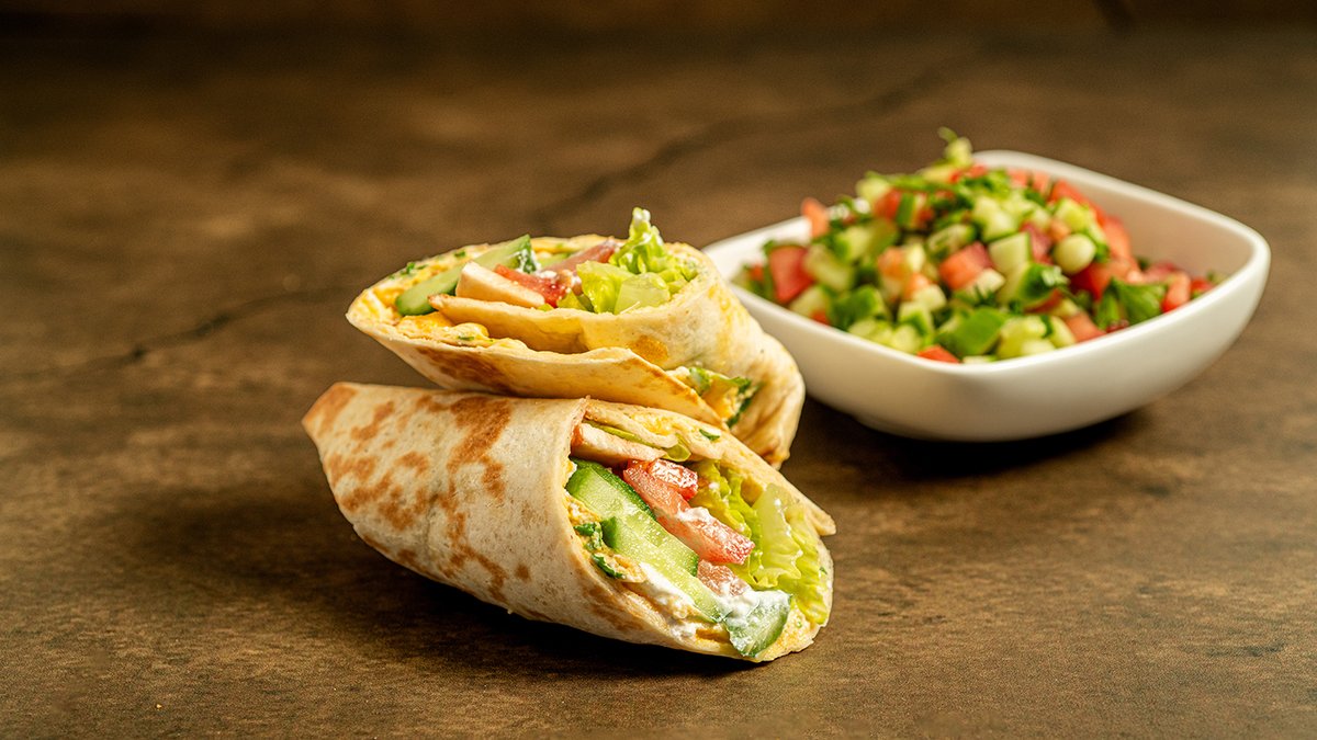 טורטייה מגולגלת עם חביתת ירק, גבינת שמנת, עגבנייה ומלפפון, סלטון בצד