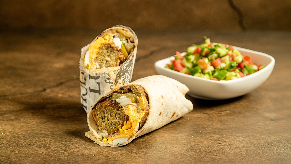טורטייה פריכה במילוי חציל, ביצה קשה, כדורי פלאפל וטחינה, סלטון בצד