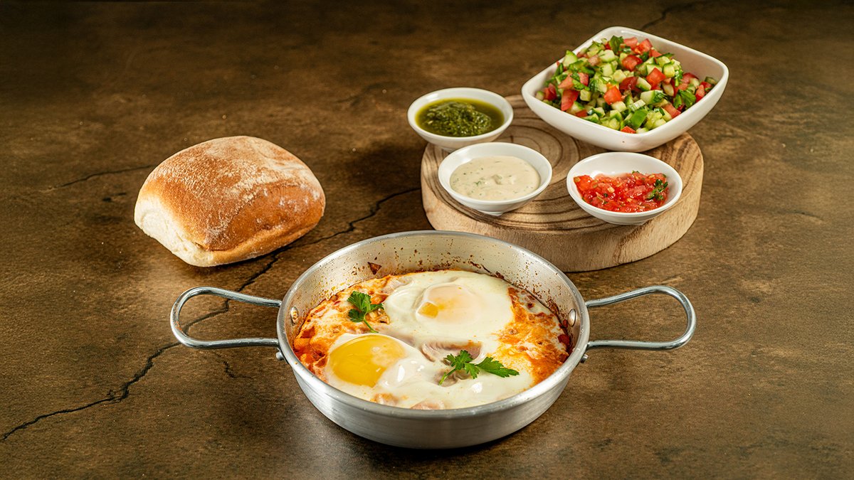 שתי ביצי משק ברוטב עגבניות פיקנטי, שום צלוי, מוגש עם סלטון לחם ומטבלים