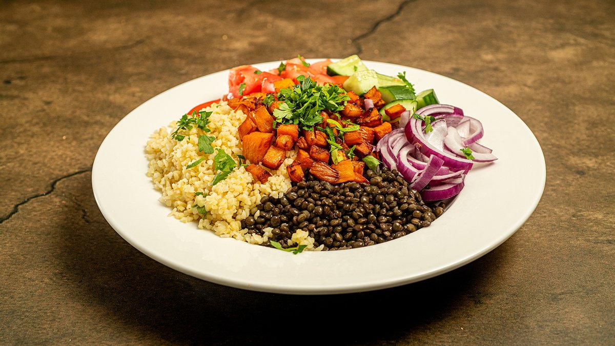בורגול, עדשים שחורות, בצל סגול, פטרוזיליה, עגבנייה, מלפפון, אגוזי מלך ובטטה