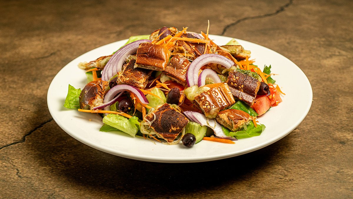 קוביות טוסט עם גבינת עמק ופסטו על מצע חסה, ירקות וזיתי קלמטה