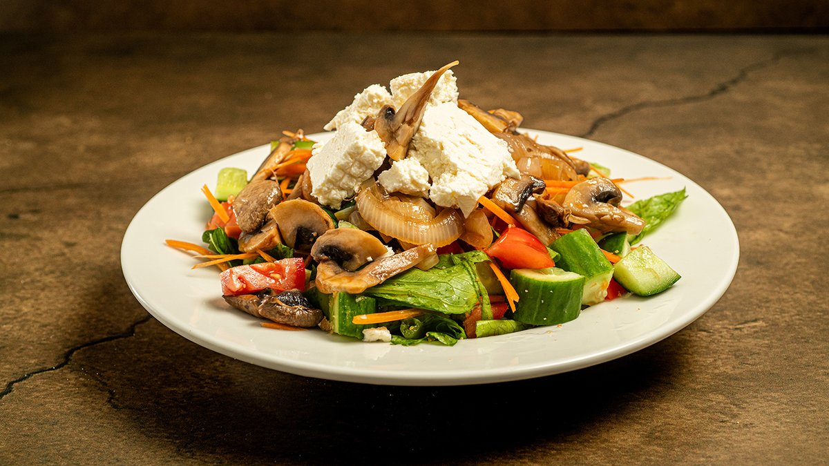 חסה, מלפפון, עגבנייה, גזר, גבינה בולגרית, פטריות ובצל ברוטב אסייתי