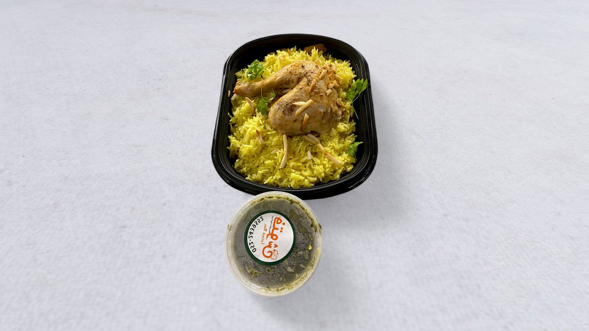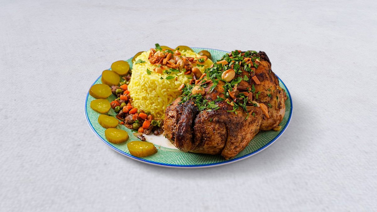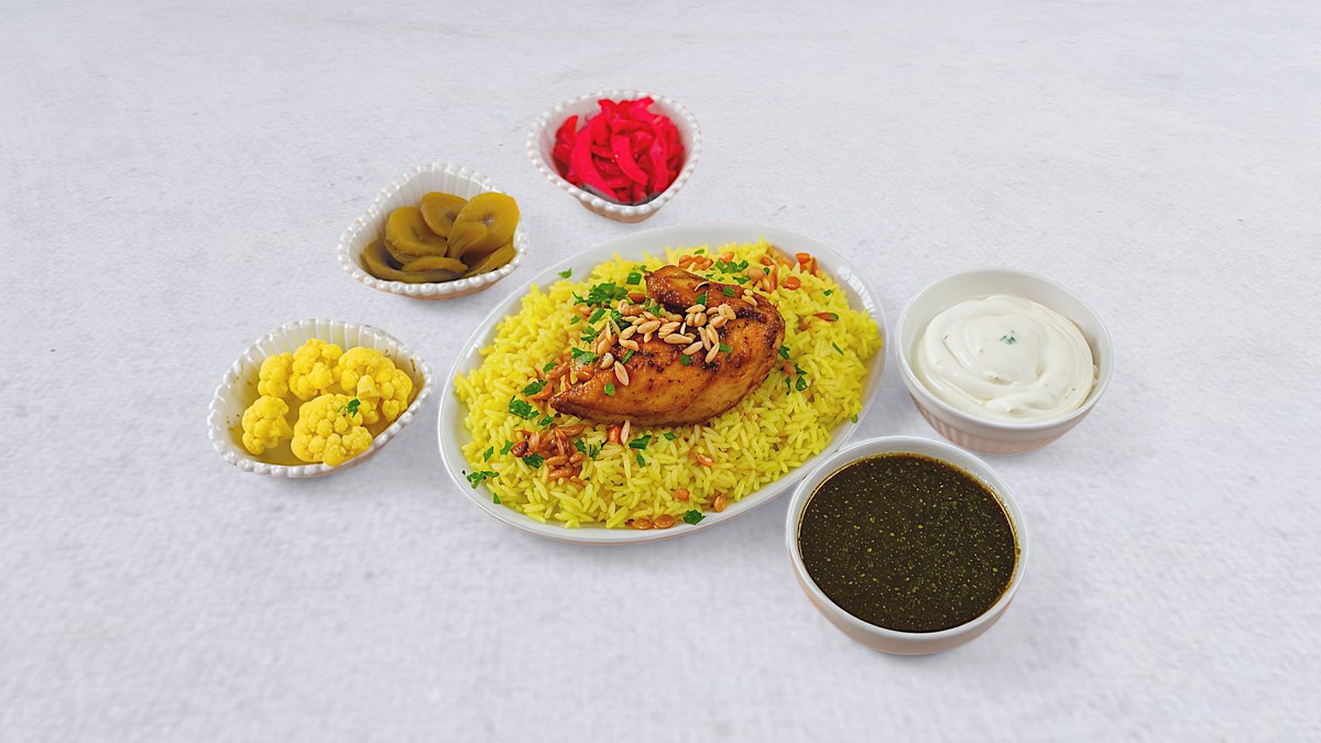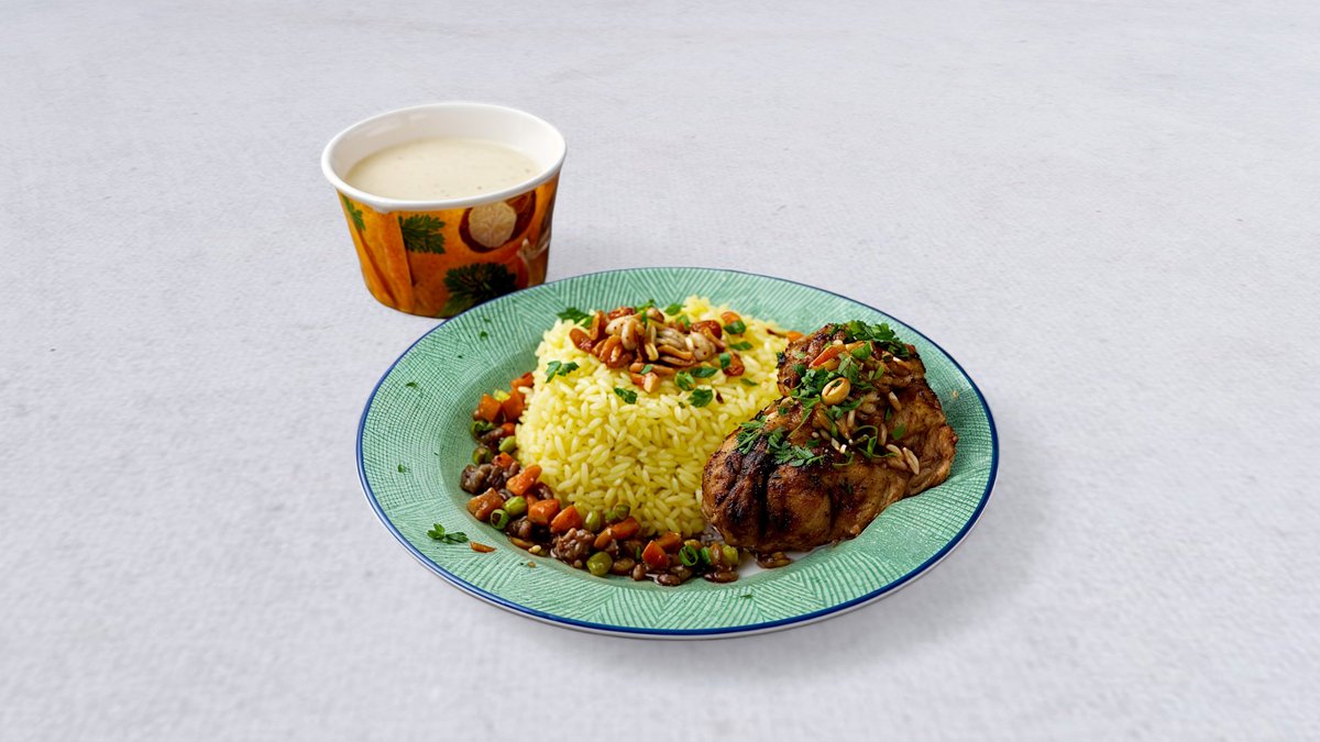עוף, אורז, גרגיר חומוס ושום, מוגש עם סלט ירקות ויוגורט