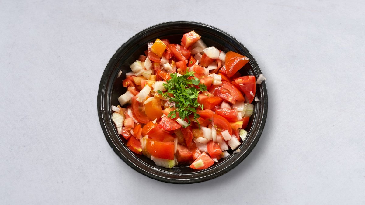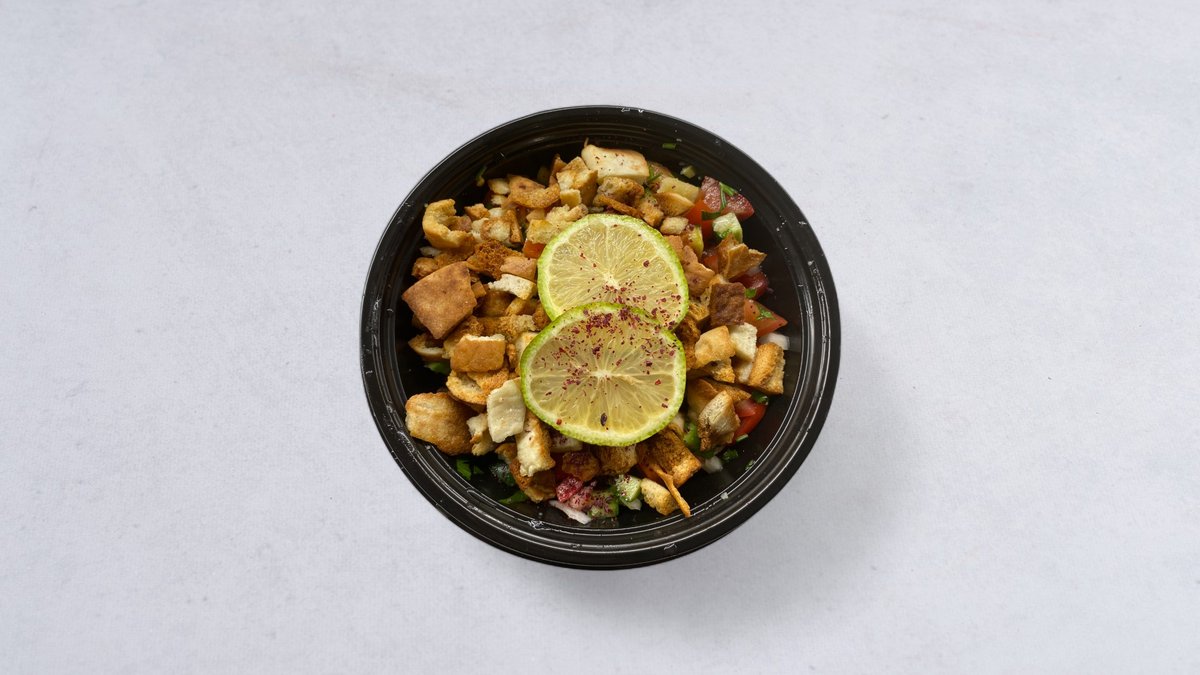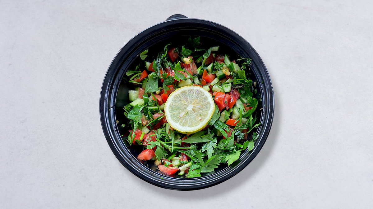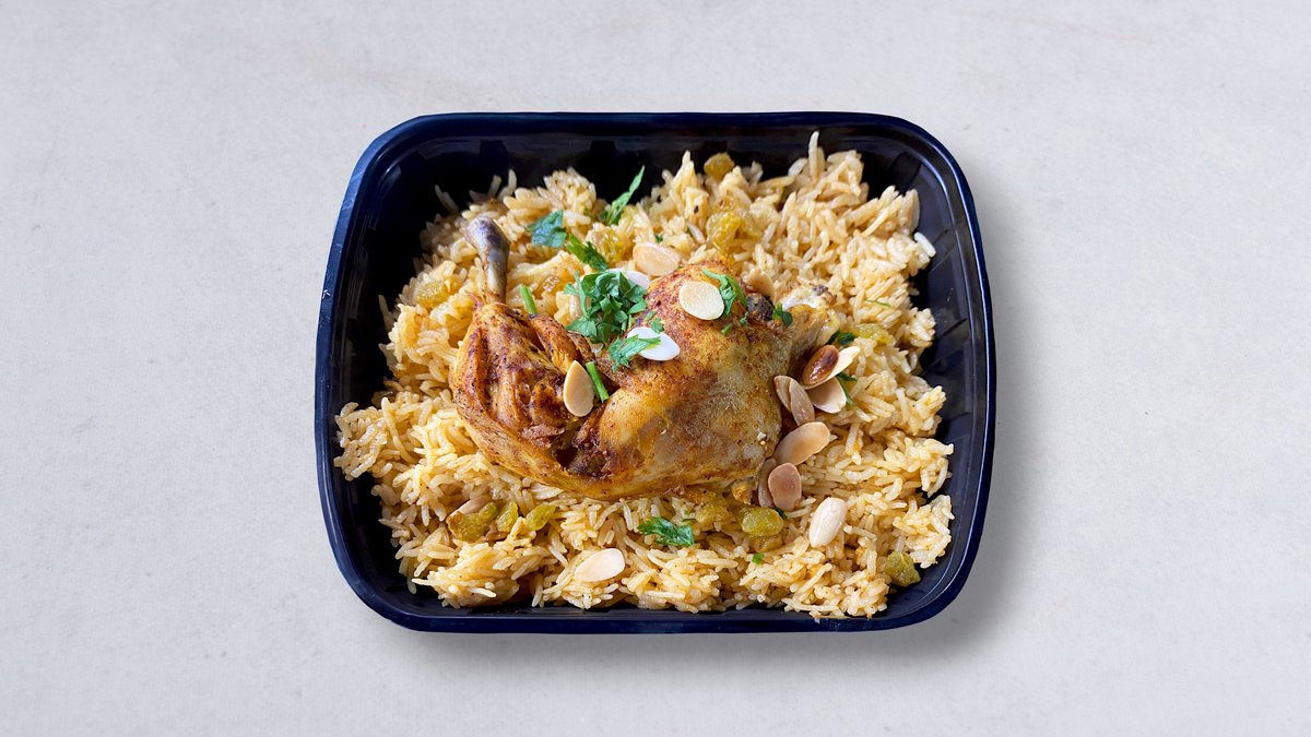 עוף, אורז, גרגיר חומוס ושום, מוגש עם סלט ירקות ויוגורט