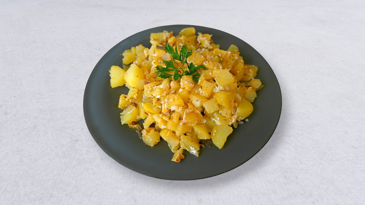 תבשיל אורז, תפוח אדמה ועוף, מוגש עם סלט ירקות ויוגורט