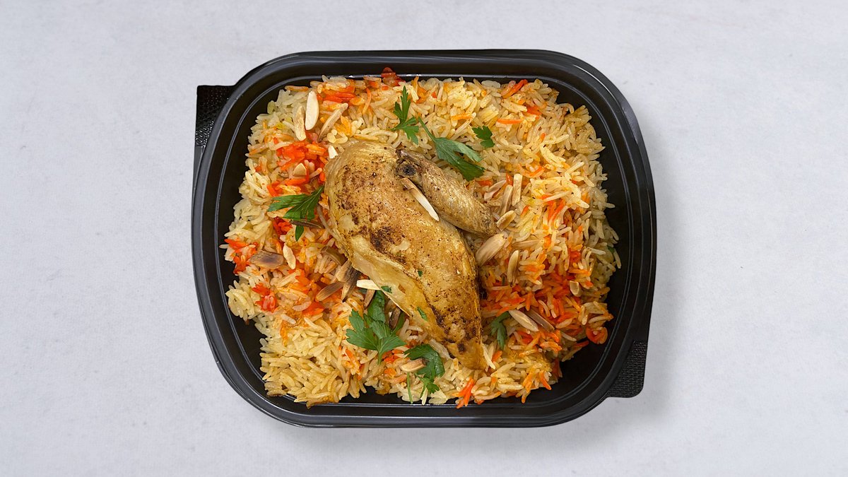 תבשיל אורז ועוף עם ירקות, גזר וחצילים, מוגש עם סלט ירקות או יוגורט