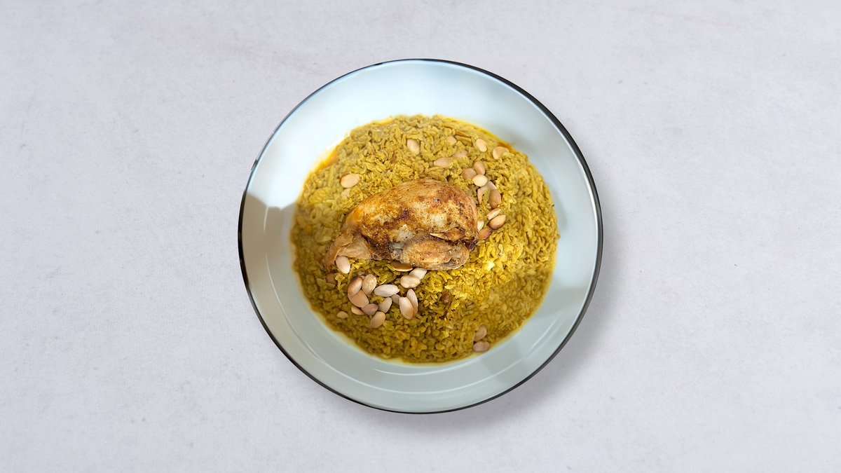 תבשיל אורז עם עוף ושקדים מבושלים ביוגורט, מוגש עם לבן עיזים