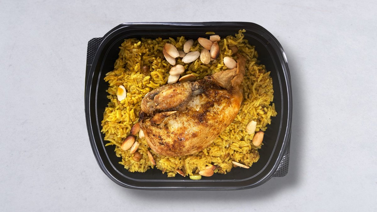 תבשיל אורז צבעוני עם תבלינים ועוף מעושן, מוגש עם סלט ירקות ויוגורט