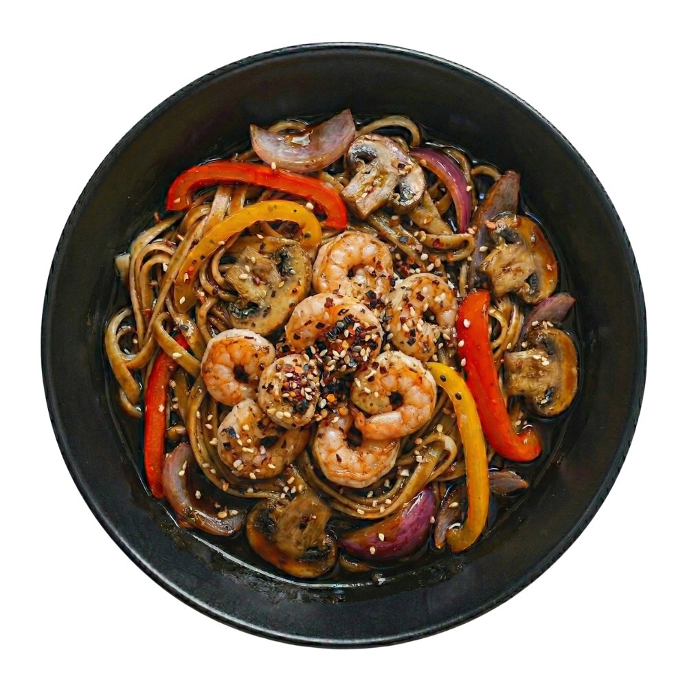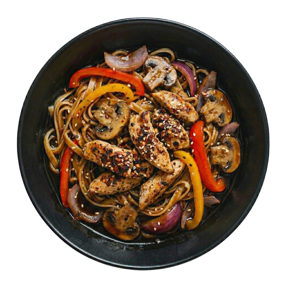 מוגש עם תערובת עשירה של ירקות (פטריות מוקפצות, פלפלים ובצל סגול), מקושט בבצל ירוק, פתיתי צ'ילי ושומשום.