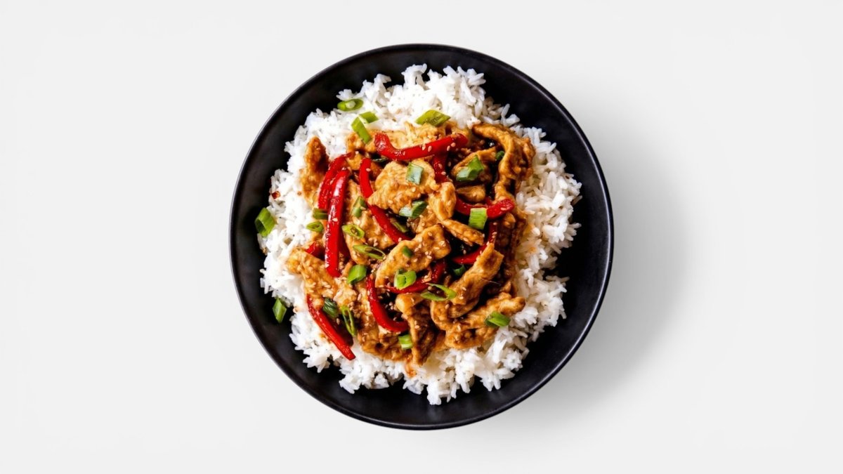 פרוסות חזה עוף, פלפל אדום, פלפלי צ'ילי מיובשים, מקושטים בבצל ירוק ושומשום، מוגש עם אורז בסמטי