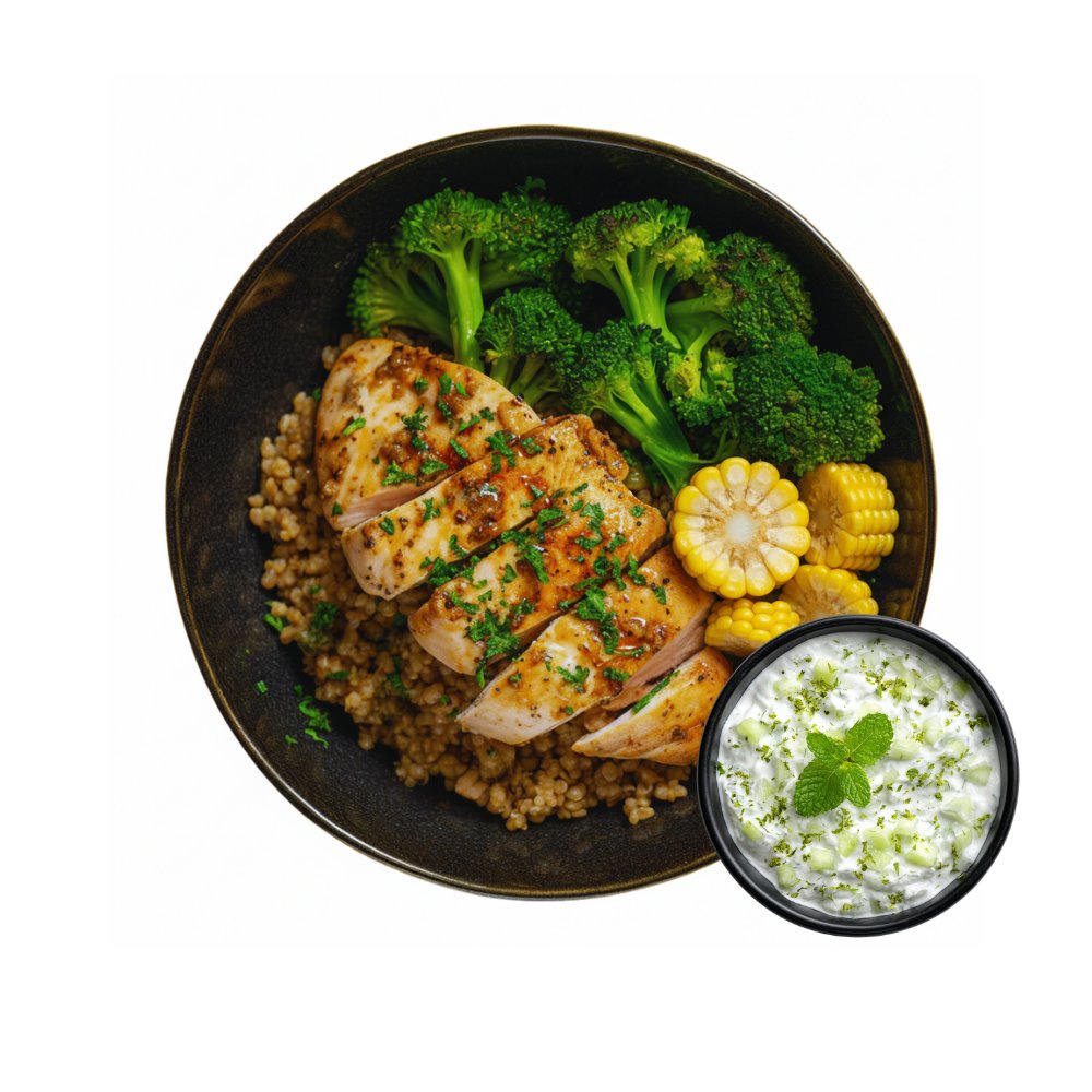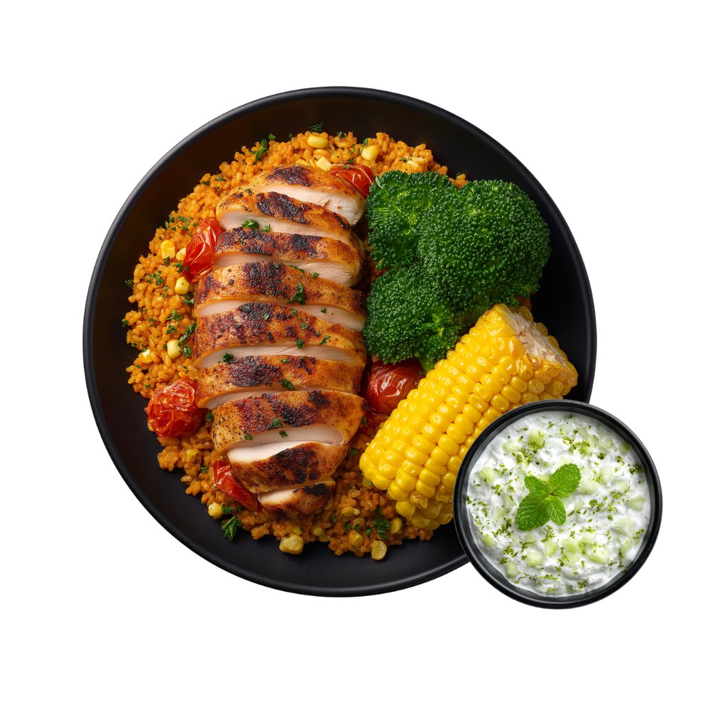 בורגול עם עוף בגריל, ברוקולי, תירס ועגבניות שרי אפויות מוגש עם סלט "מלפפון ויוגורט" בצד.