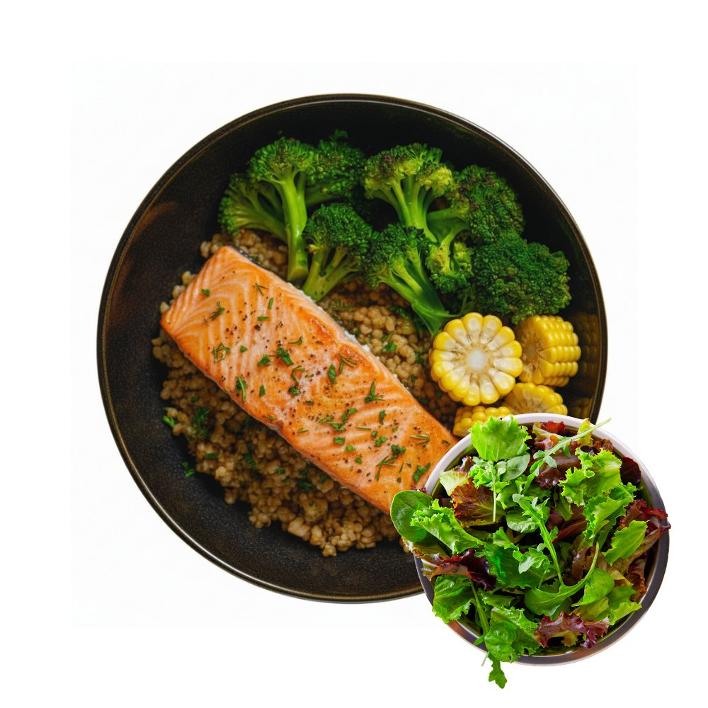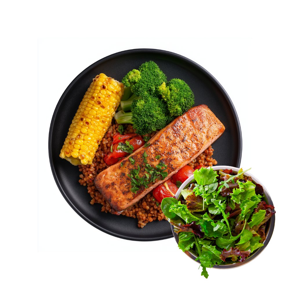 פריקה עם פילה סלמון צלוי עם ברוקולי ותירס. מוגש עם סלט ירוק בצד.