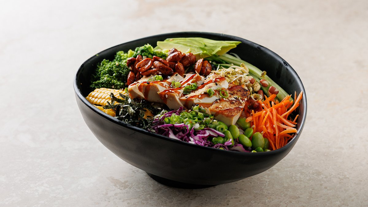 Tofu in teriyaki glaze, cucumber, carrot, soybeans, bean sprouts, corn, avocado, green onions, nori seaweed and spicy peanuts.