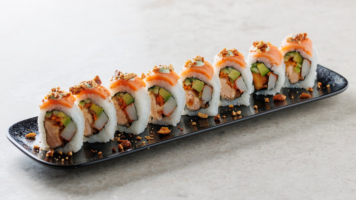 Salmon, avocado, chives and cucumber, wrapped in a layer of charred salmon, crispy sweet potato and teriyaki