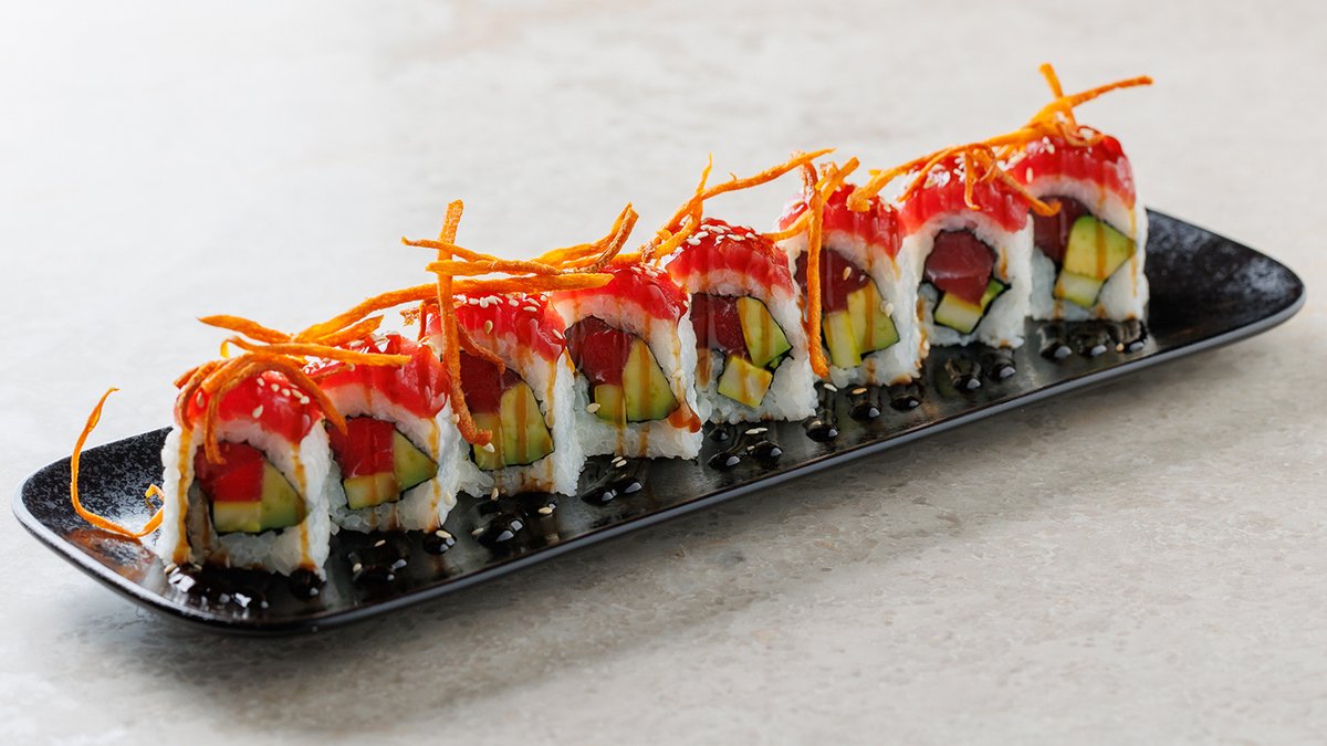 Tuna, avocado, chives and Japanese radish, wrapped in tuna, teriyaki, crispy sweet potato and sesame seeds