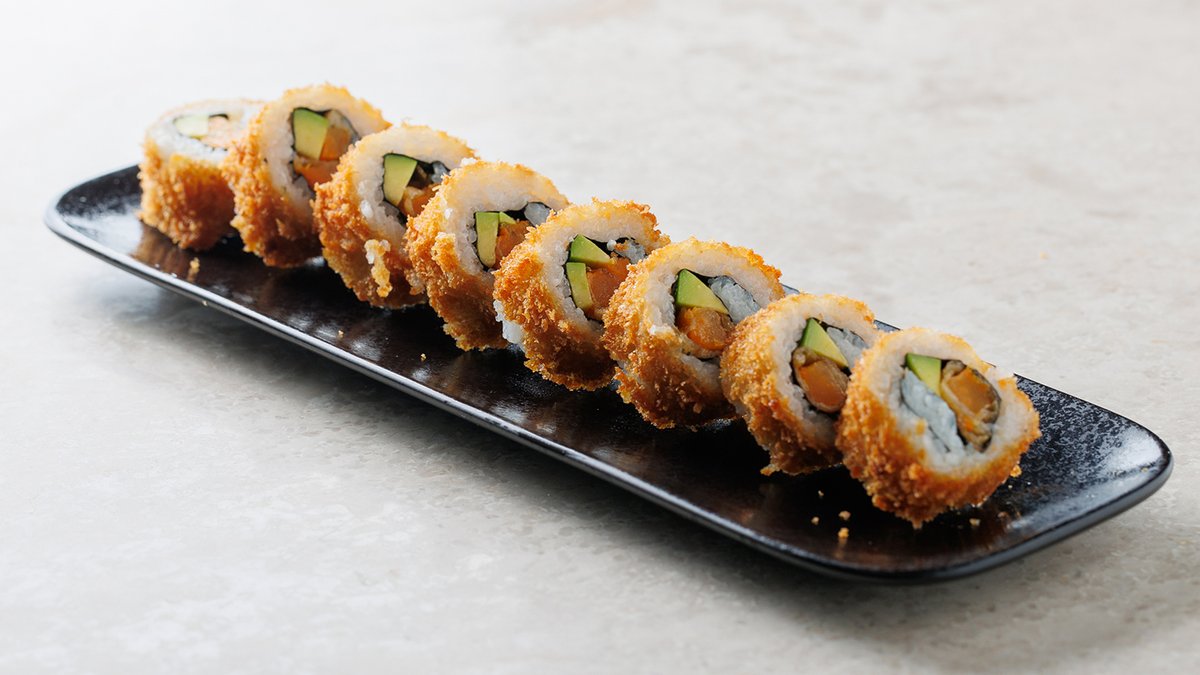 Fried roll, avocado, salmon, sweet potato and mushrooms