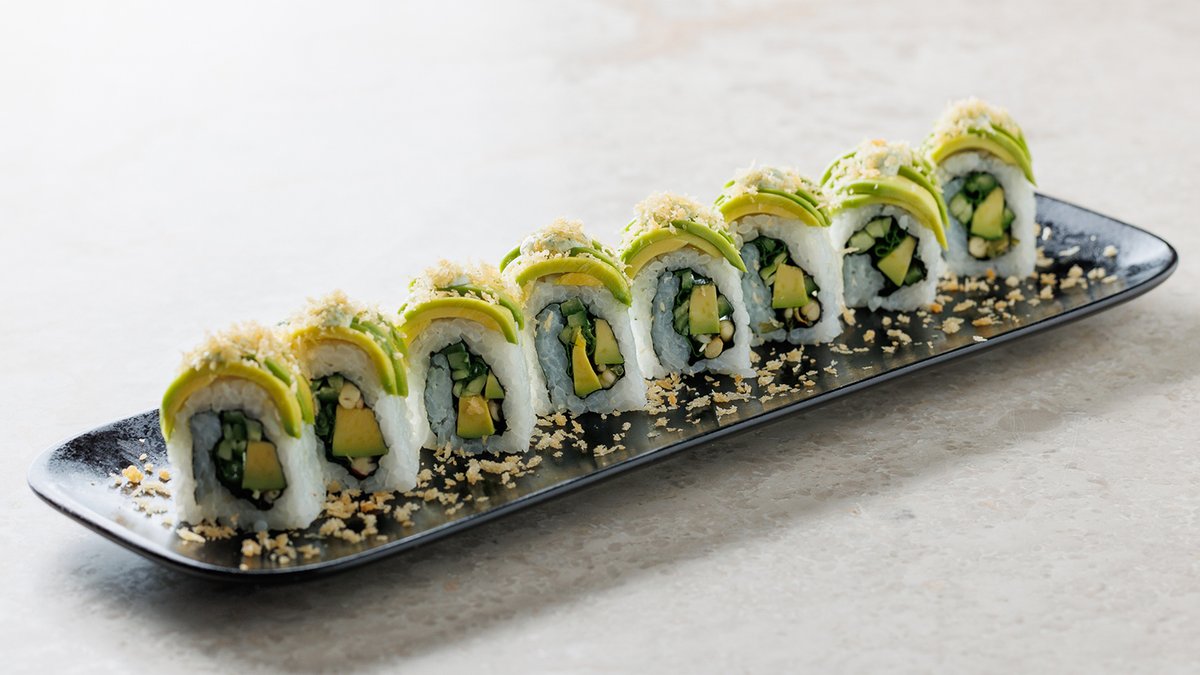 Cucumber, mint, green onion and sprouts, wrapped in avocado, mint aioli and crispy panko