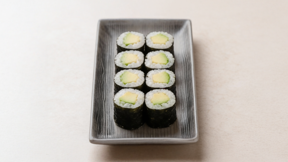 Surimi, avocado, cucumber, and chives with rice wrapped in sesame mix